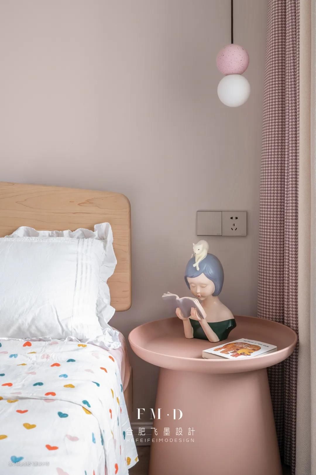 儿童房是方便小朋友偶尔来住,粉色的少女系搭配,是孩子喜欢的颜色,连床头柜都有一种圆润的萌感;细节处,方显用心。