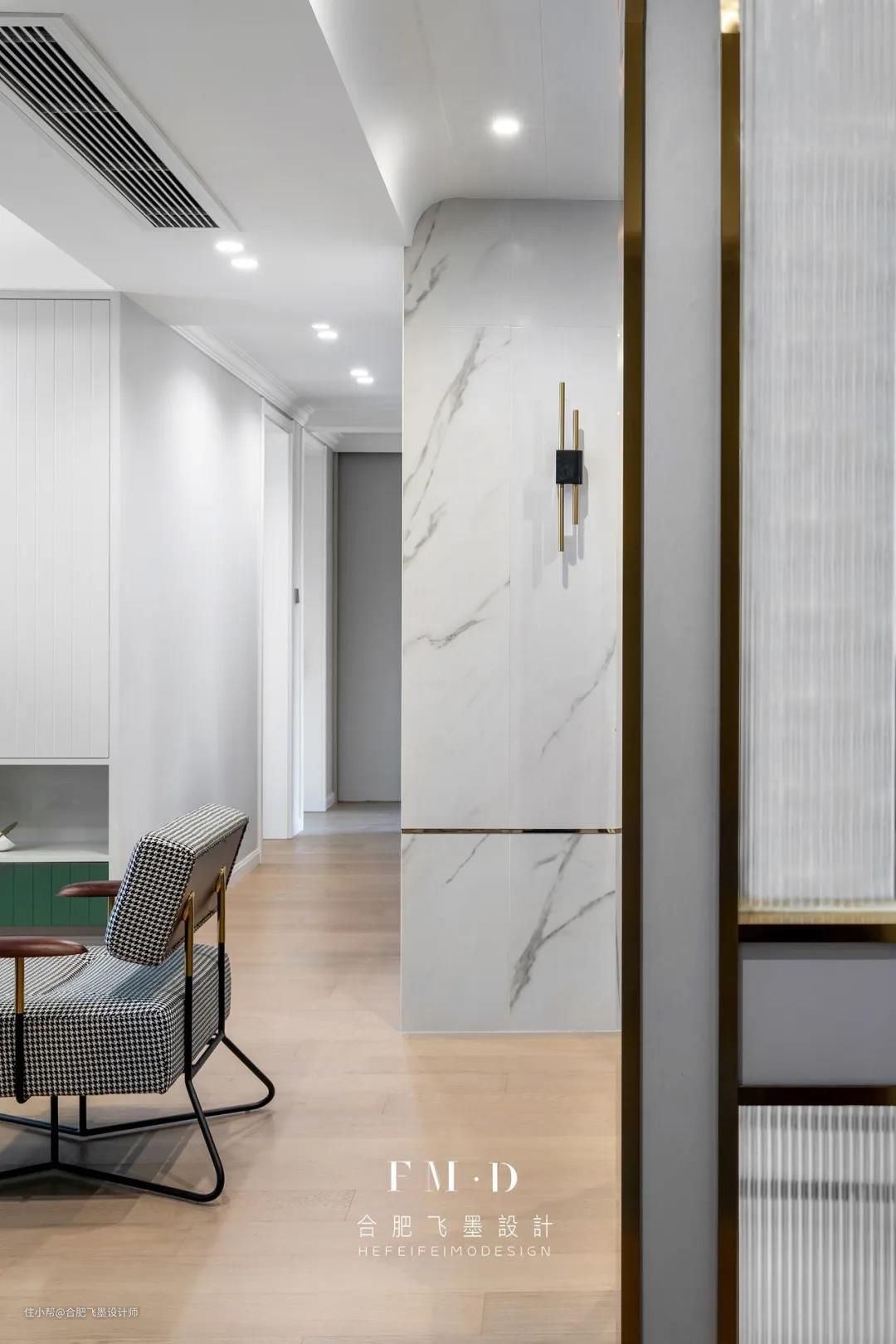 入户玄关处原来是一堵实墙,隐私性虽好,但却没有好的采光与舒适度;设计师用一扇半透明的长虹玻璃+金属镶边做了玄关后,在保证室内隐私的基础上,增加了采光,提升了整体颜值。