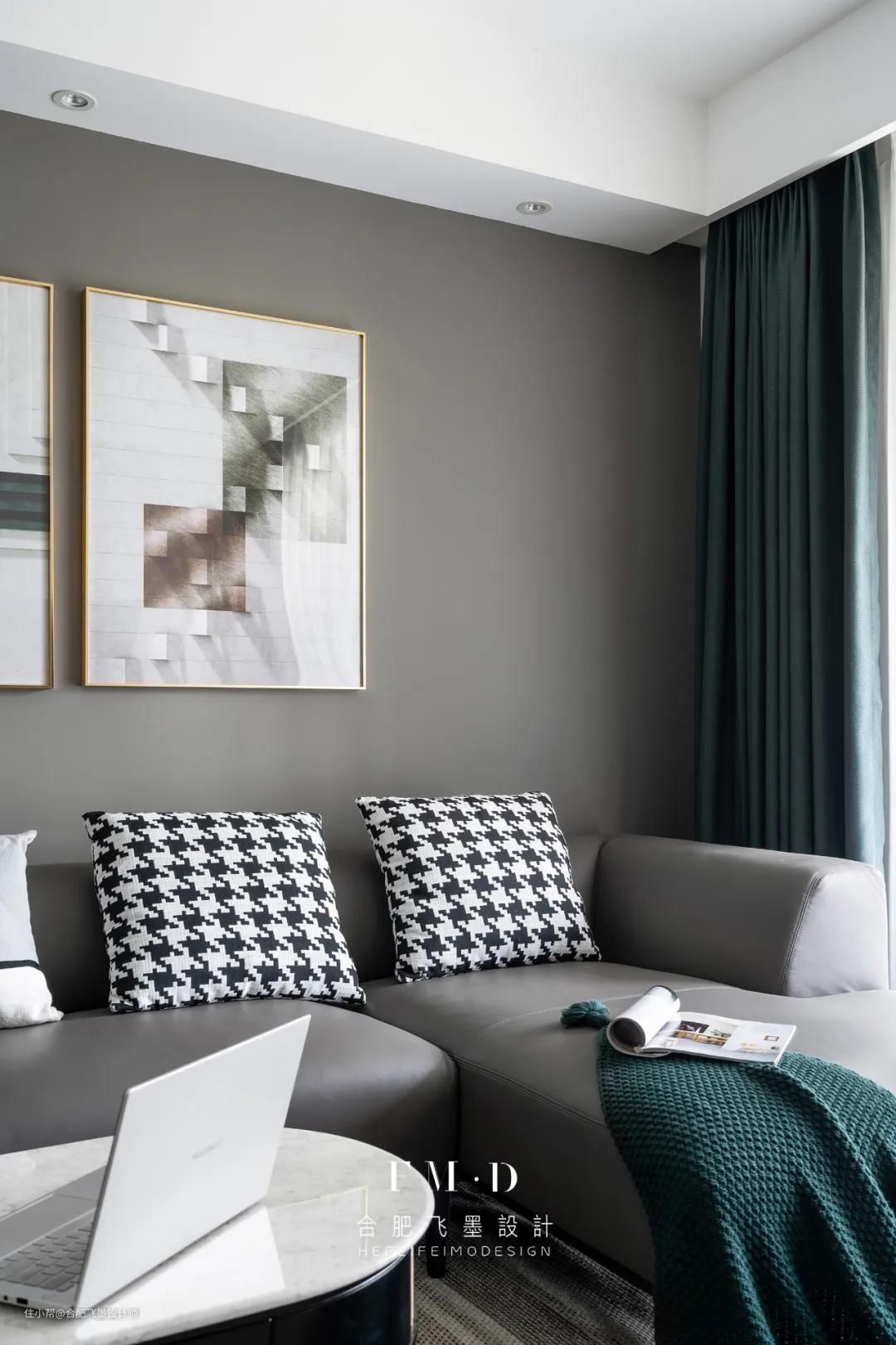 灰色是一种不显山露水的高级,用在墙面,是空间的冷淡调性,用在沙发,是家具质感的体现,配合原木色地板与墨绿色窗帘,协调了空间的冷暖度,提升了整体的层次感,不可谓不妙。