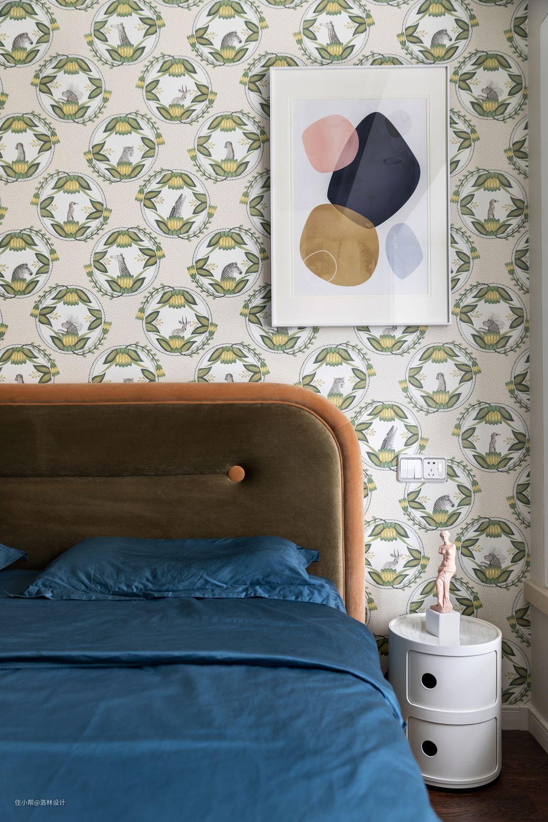 为了对应整个家的动物元素,主卧靠床的背景更换为墙纸,精心选用了 coleson 的墙纸。由一幅幅的动物肖像构成的图案,仔细看会发现一只相当傲慢的斑马和一只古怪的豹子,辅以柔和的长颈鹿斑点为背景,大色块的橄榄绿。其他三面墙运用接近墙纸背景色的浅色进口乳胶漆来搭配。