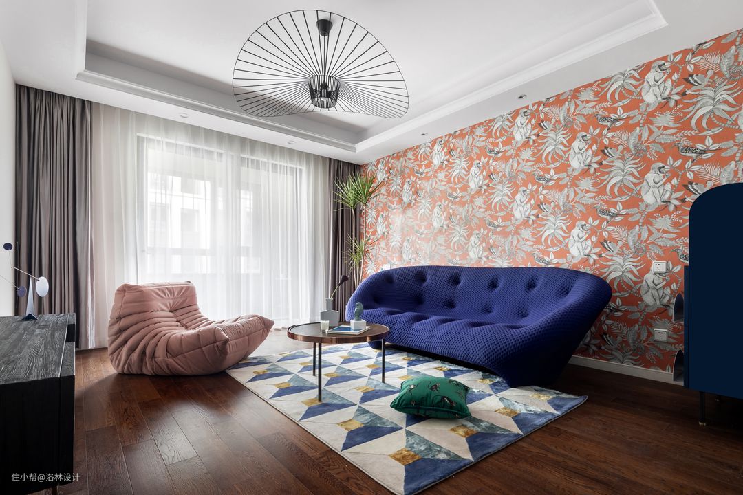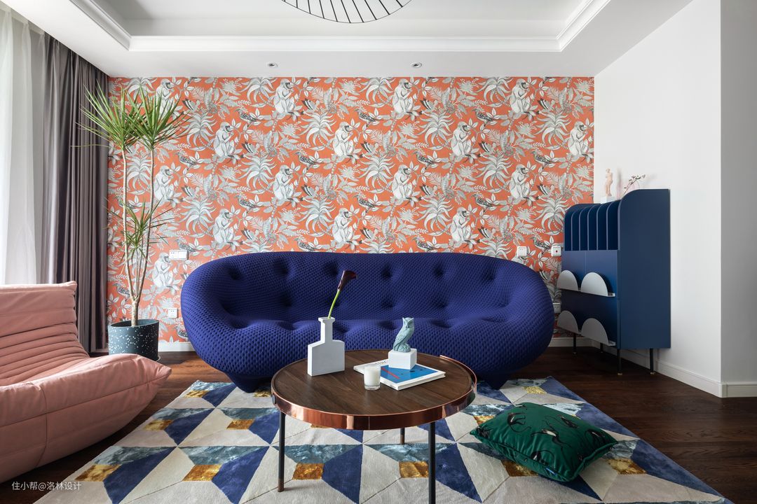 客厅是一个家最温馨的集合点。本案业主需要在客厅安装投影,所以除了正常的布置外,增加了坐在客厅观影舒适性的要求。其中作为沙发背景的一面白墙贴了明亮的橙色墙纸,图案是狒狒和变色龙在开花的珊瑚树上晒太阳,铁箍和犀鸟在叫喊和歌唱,灵动立体不呆板。然后,整个客厅再以这款墙纸为设计基点展开软装布置。