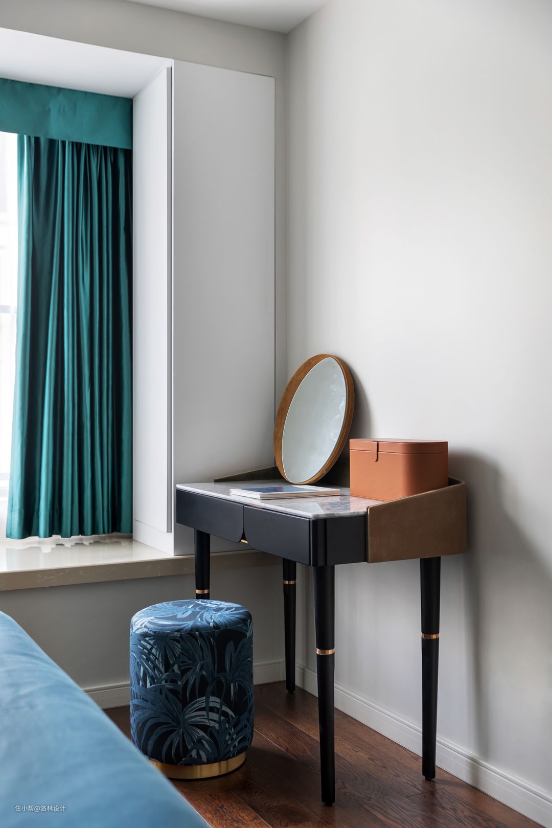 为了不让主卧显得压抑,特地没有在床旁惯性设置衣柜,取而代之的是用了原木斗柜衣帽架,作为睡衣和贴身衣物暂时悬挂的地方。