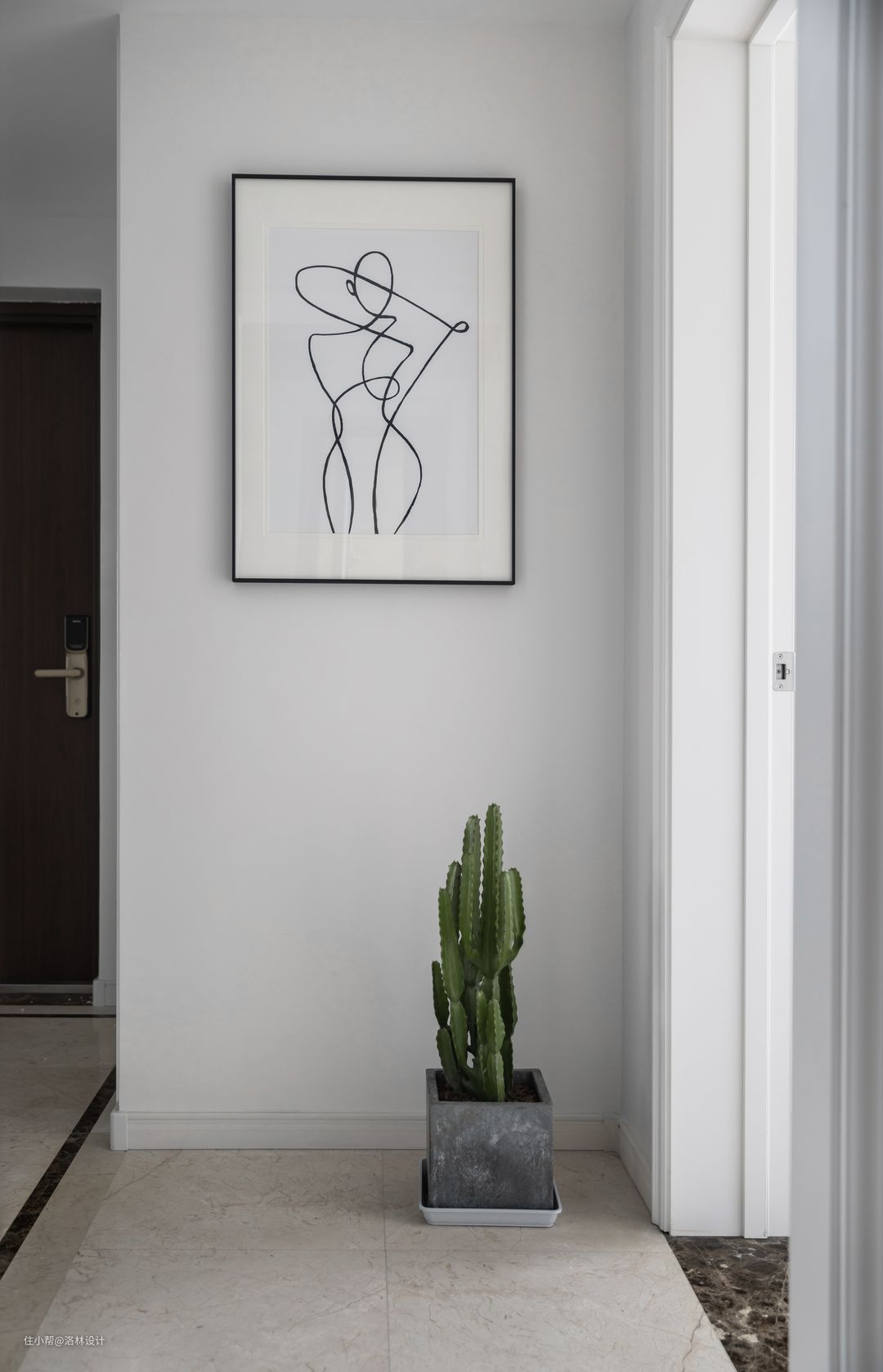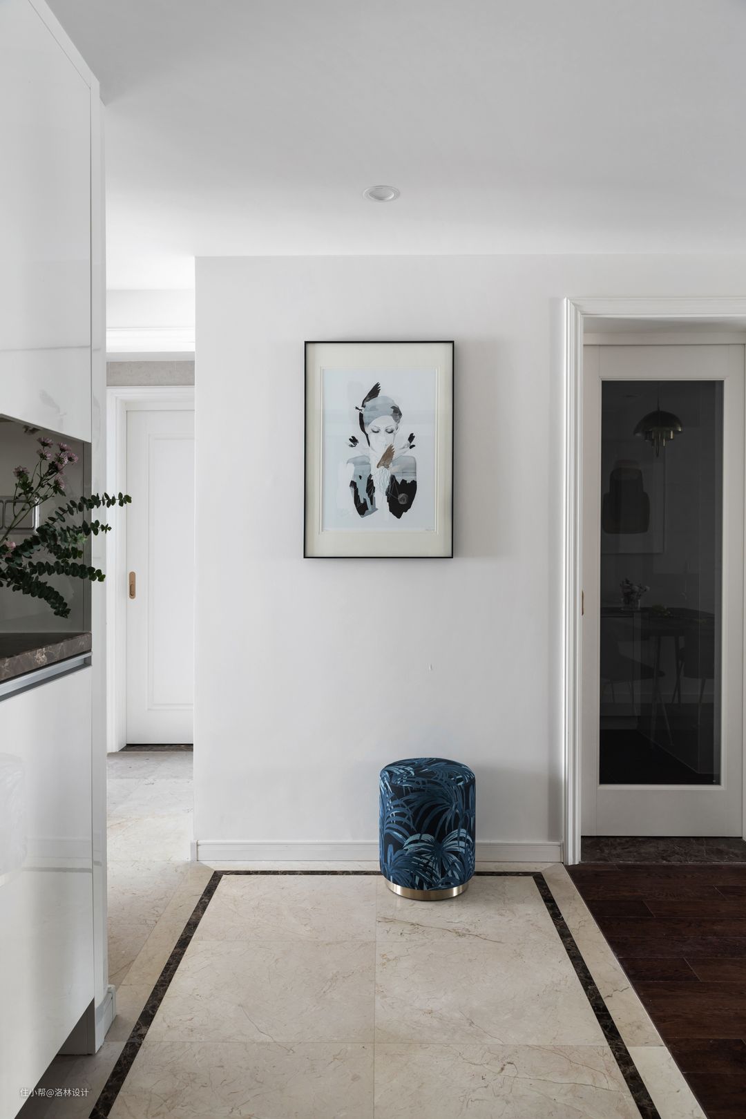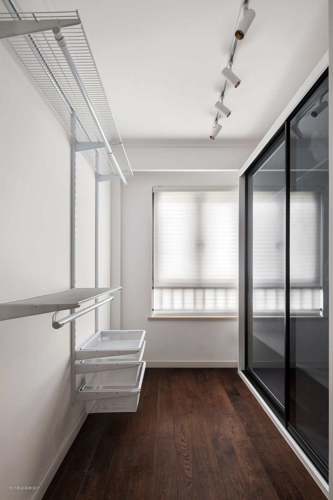 比起直接在卧室做衣柜来储物,若在空间允许的情况下,专门设计一个衣帽间解决收纳问题是越来越多业主的新选择。本案中设计师果断将小房间作为单独衣帽间,并根据业主需求设计了一面定制移门衣柜,一面为淘宝定制衣帽架,顶部还安装了轨道灯,整个空间简约的白色系,方便经济又环保。