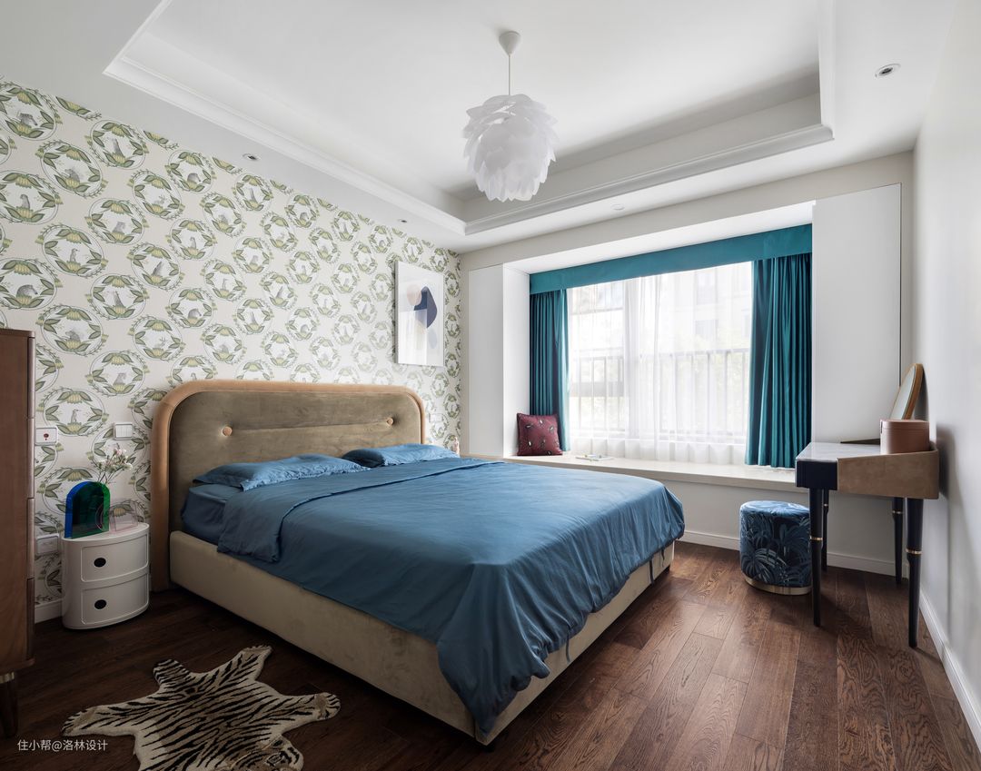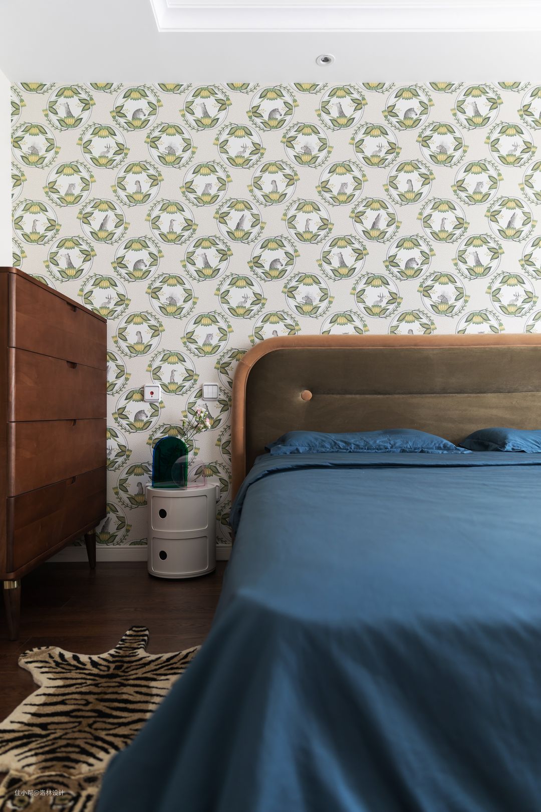 为了对应整个家的动物元素,主卧靠床的背景更换为墙纸,精心选用了 coleson 的墙纸。由一幅幅的动物肖像构成的图案,仔细看会发现一只相当傲慢的斑马和一只古怪的豹子,辅以柔和的长颈鹿斑点为背景,大色块的橄榄绿。其他三面墙运用接近墙纸背景色的浅色进口乳胶漆来搭配。