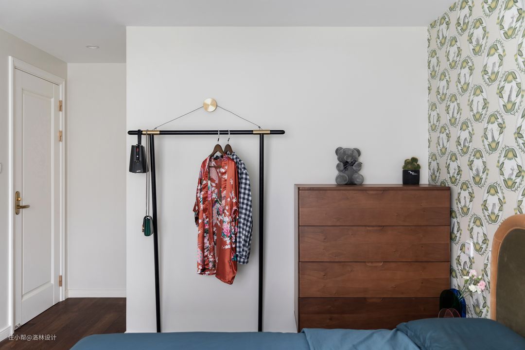 为了不让主卧显得压抑,特地没有在床旁惯性设置衣柜,取而代之的是用了原木斗柜衣帽架,作为睡衣和贴身衣物暂时悬挂的地方。