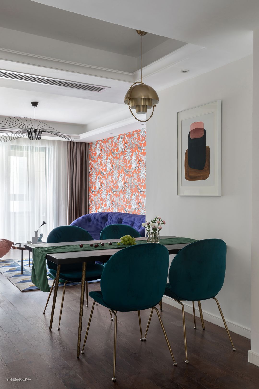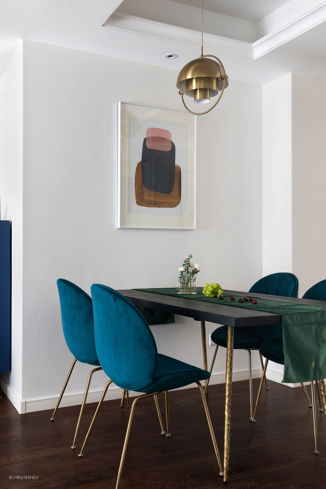 餐厅空间连着客厅和门厅,恰到好处地利用了过渡地带,餐厅装修会直接影响用餐的心情,为了给女业主营造轻奢的感觉,在细节上花了点小心思。比如,顶部是gubi的吊灯,桌腿蹬腿均采用黄铜,墙面则刷了浅浅的进口涂料,内敛又不乏气质。