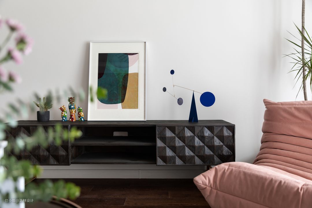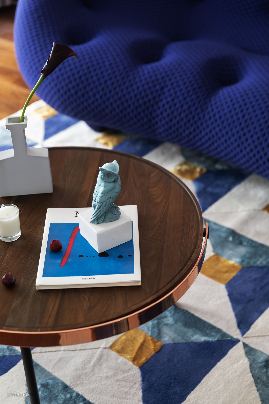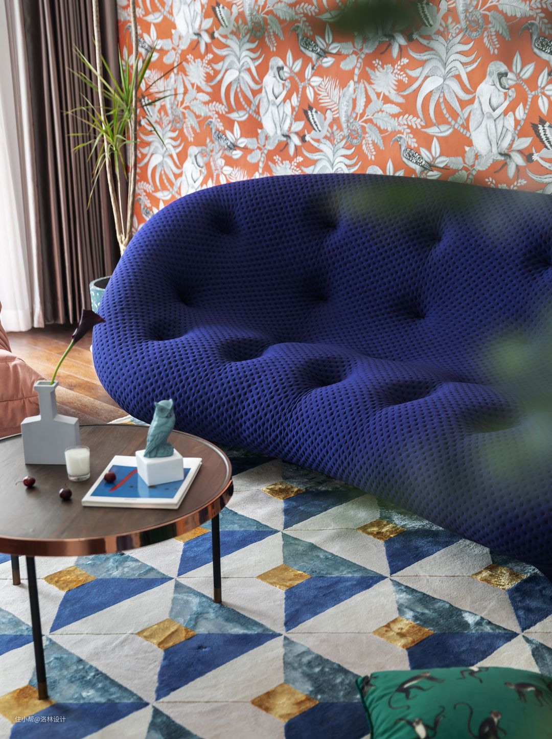 家居选品可以展现主人的生活品味,「在有限的预算里,尽可能购买正版家居」是软装设计的出发点。1973年,法国著名工业设计师 Michel Ducaroy 将一筒牙膏本身折叠,由此而来的灵感造就了全球第一款全泡棉沙发的诞生。作为一款备受欢迎的沙发,这次设计师选择了脏粉面料,呼应橙色墙纸,让人一坐下就非常放松。主沙发则挑选了法国品牌 Ligne Roset 的 Polum 沙发,并大胆挑战了蓝紫色。最后配以几何线条的地毯,聚拢整个客厅的中心,和立体颜色呼应。