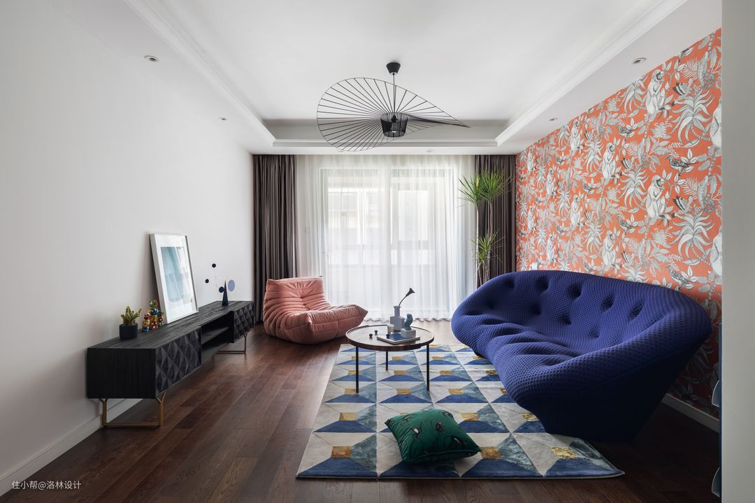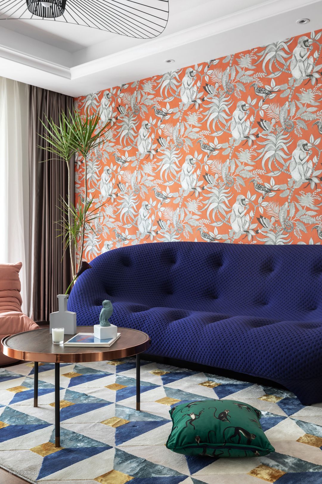 客厅是一个家最温馨的集合点。本案业主需要在客厅安装投影,所以除了正常的布置外,增加了坐在客厅观影舒适性的要求。其中作为沙发背景的一面白墙贴了明亮的橙色墙纸,图案是狒狒和变色龙在开花的珊瑚树上晒太阳,铁箍和犀鸟在叫喊和歌唱,灵动立体不呆板。然后,整个客厅再以这款墙纸为设计基点展开软装布置。