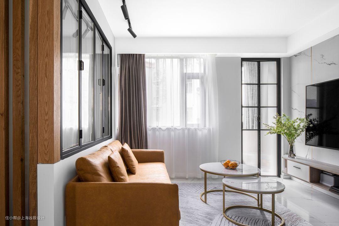较狭长的客厅,我们把沙发往前移,利用多出来的面积做个独立的书房,巧用隔断设计让小户型客厅的利用率更高。v