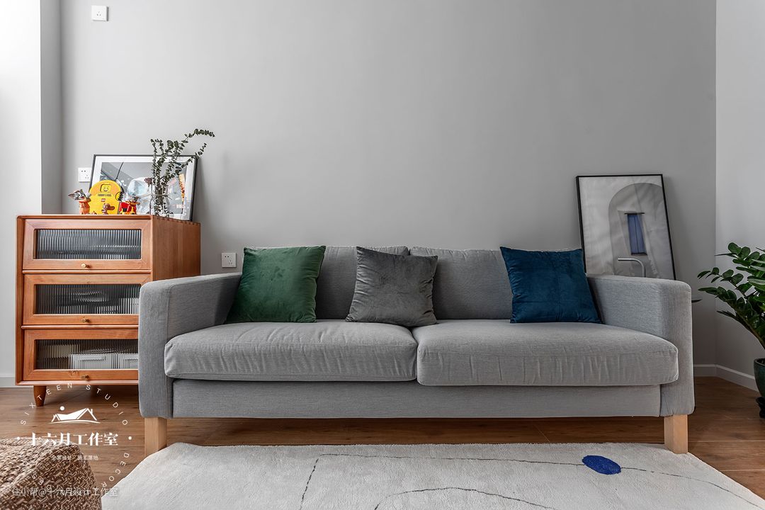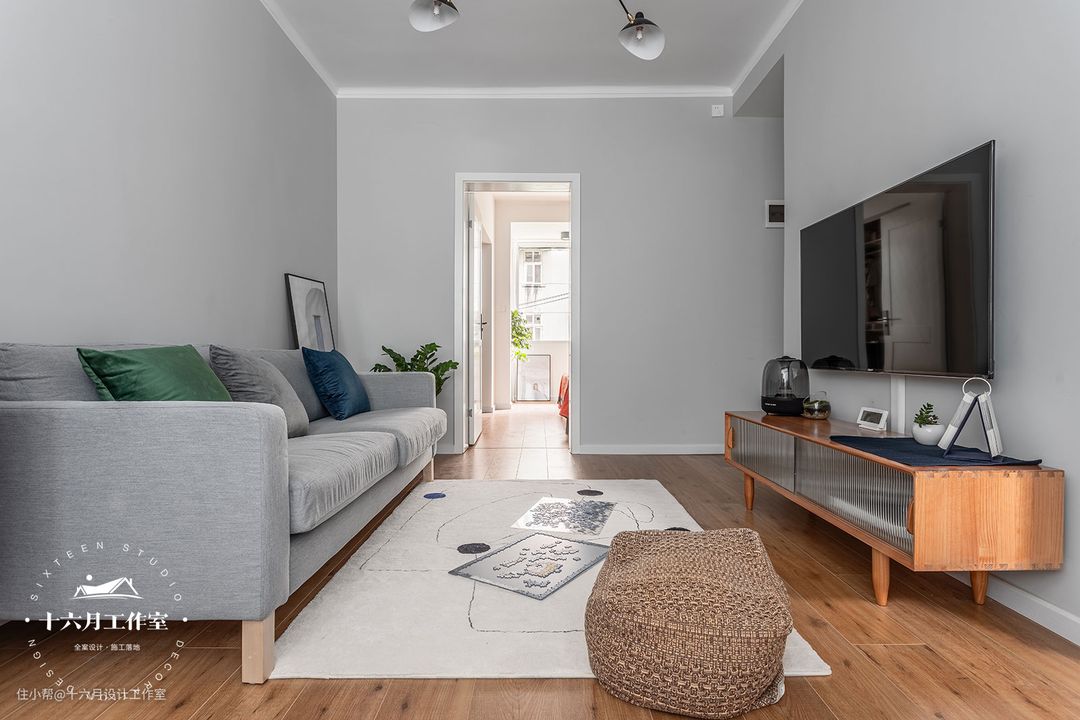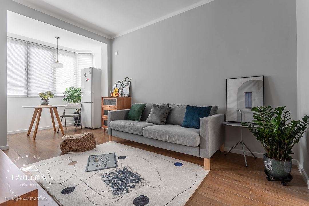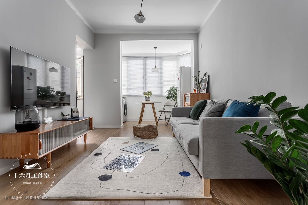 客厅是简单的沙发加电视机搭配组合,把茶几丢出客厅,用一张地毯代替,显得家里空间更大。