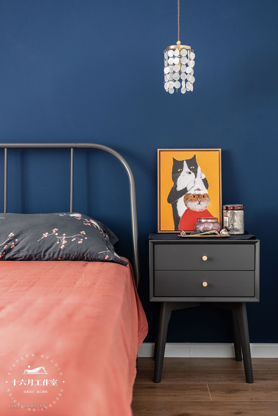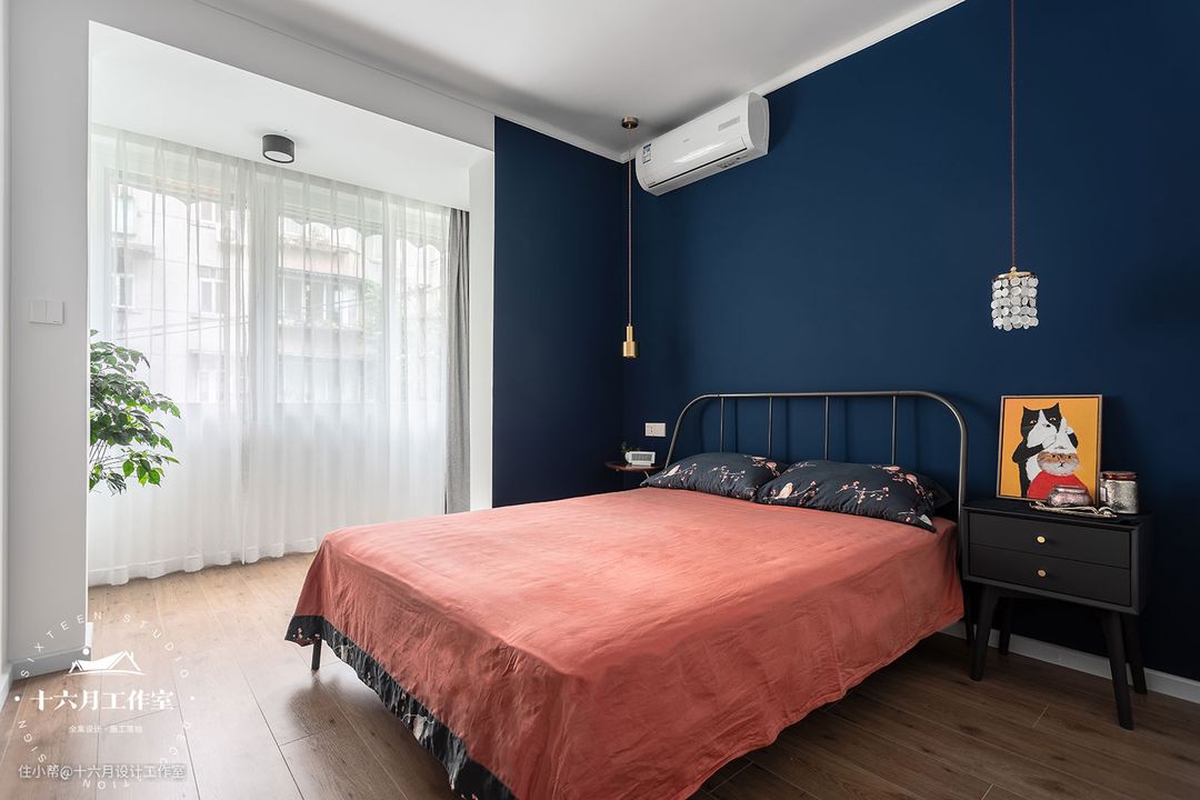 主卧拥有一个单独的大阳台,蓝色的墙面辅以金色元素壁灯做气质床背景,搭配细腻的胡桃木家具,让大面积的蓝色有了时尚气息。