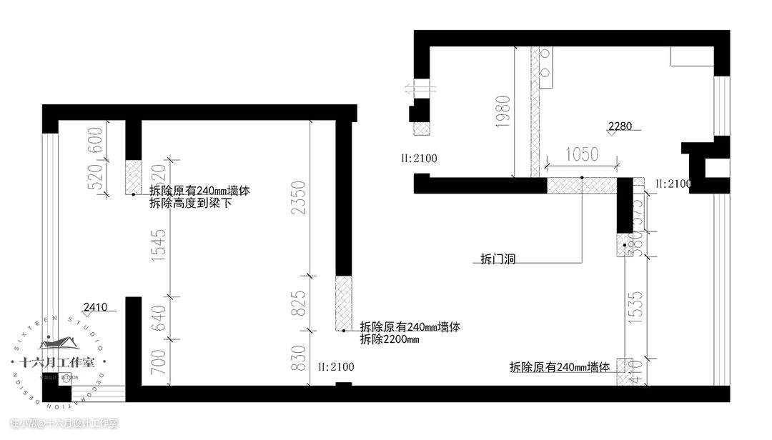 ③把现有的厨房墙面拆除1050mm,开了一个门洞,作为厨房入口