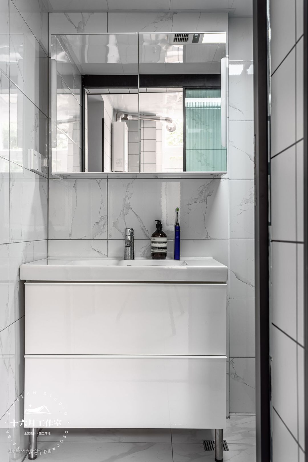 洗漱台表面看起来很整洁,做了镜下柜,具有强大的收纳功能,不怕灰尘,两旁做了LED灯带,让生活充满小惊喜。