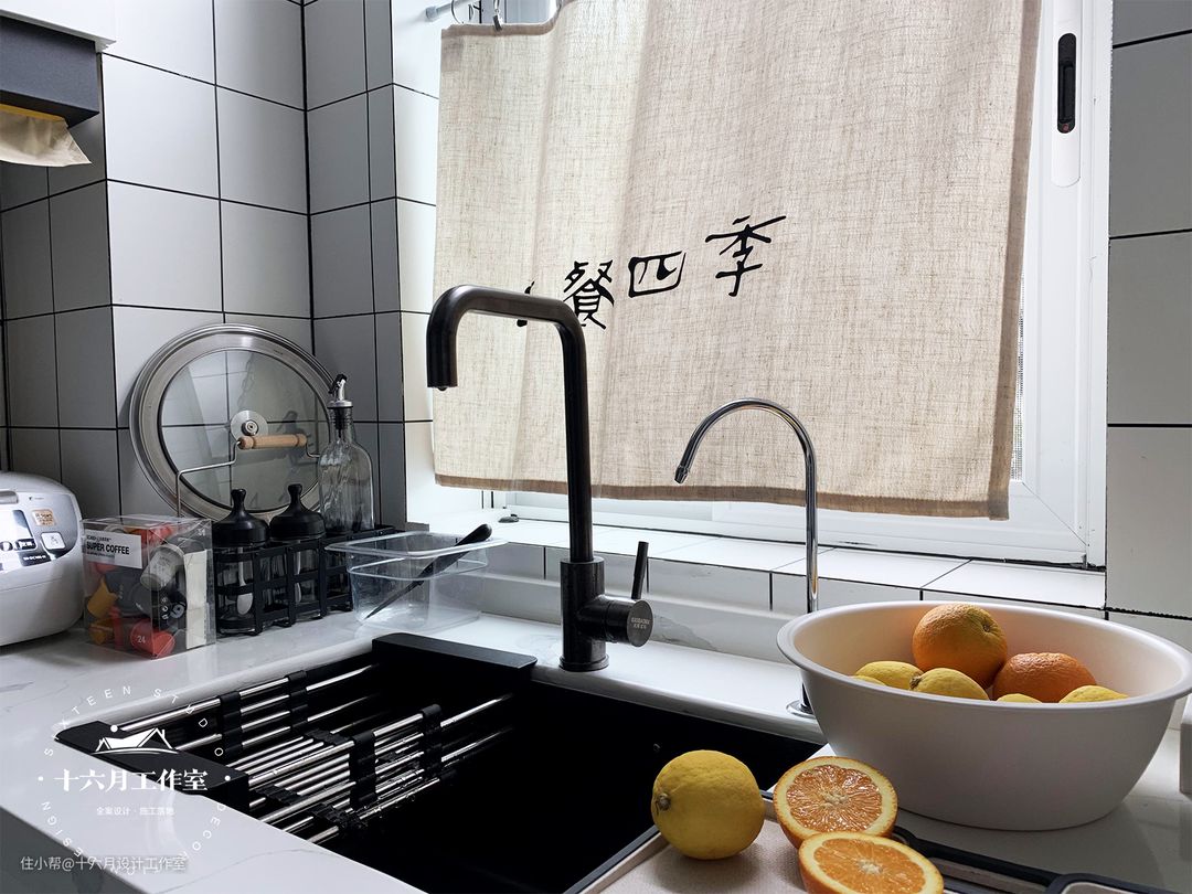厨房墙面的瓷砖采用白砖黑线,橱柜采用通体白色,很有线条感,三餐四季,这就是我向往的生活。