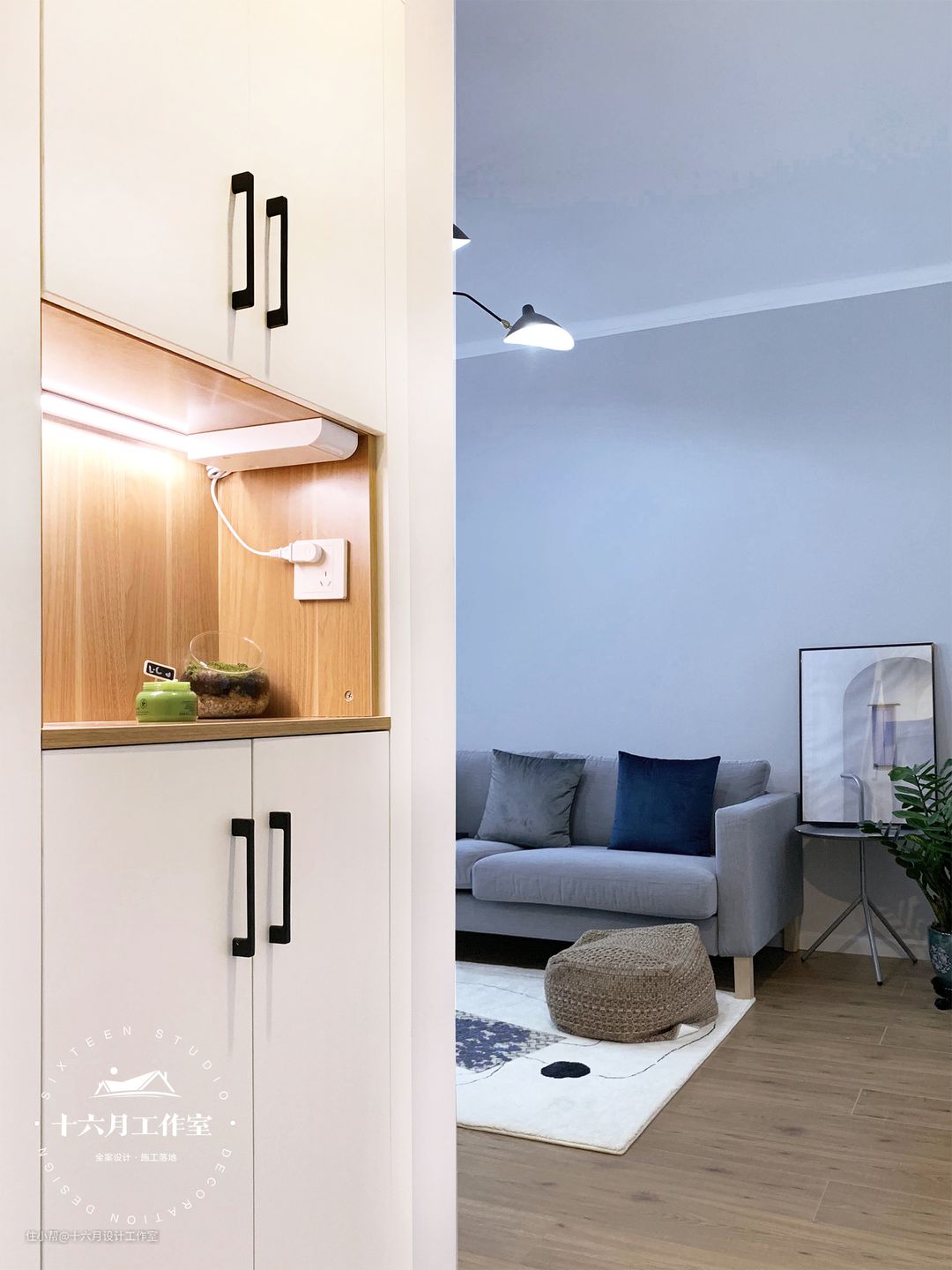 改造之前是没有玄关的,入户左手方是一个卧室的入口,现在玄关柜的位置是我们新建的墙体,打造的入户玄关并且做了整面靠墙的白色玄关柜,大面积留白,加上镜下灯的辅助,看起来很明亮,视觉感增强。