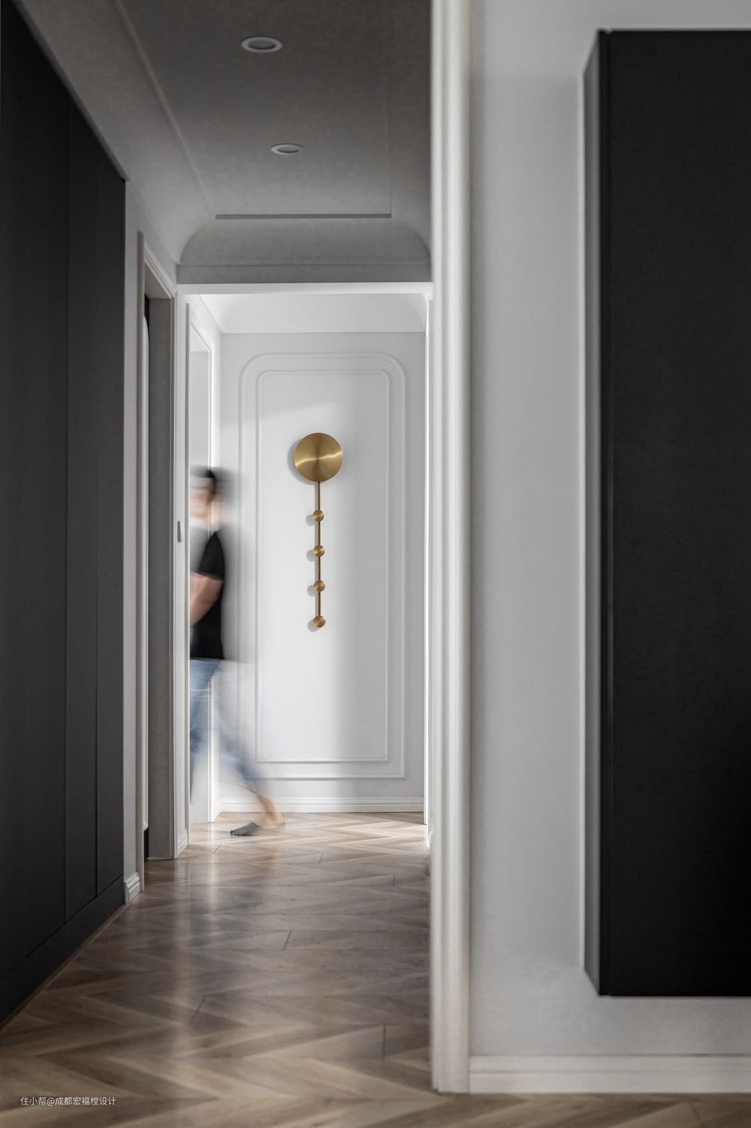 走廊进行了边顶造型设计,地板也延续客餐厅的鱼骨拼设计,使得每个空间似乎都有着微妙的关联性,同时又充满独特性。#湘君 #宏福樘设计 #走廊