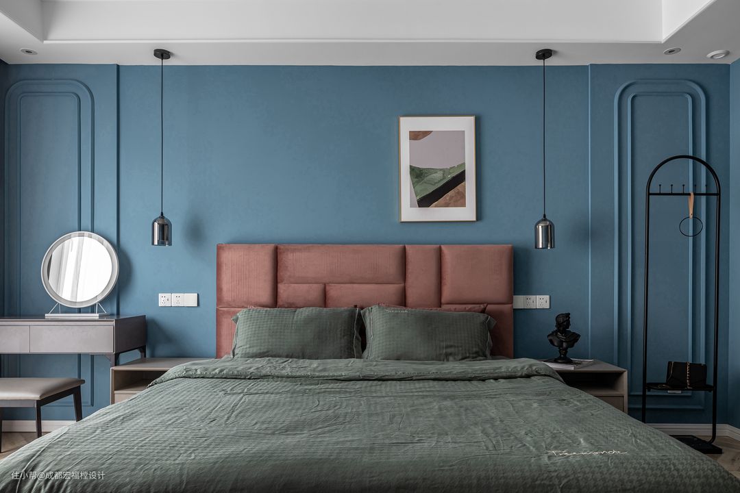 卧室属于非常个性化的私密空间,我们通过挖掘屋主最隐秘真实的色彩喜好,来进行与客餐厅完全不同的风格搭配。整体选择小体量的几何造型家具,使得卧室看起来更宽敞。#湘君 #宏福樘设计 #卧室