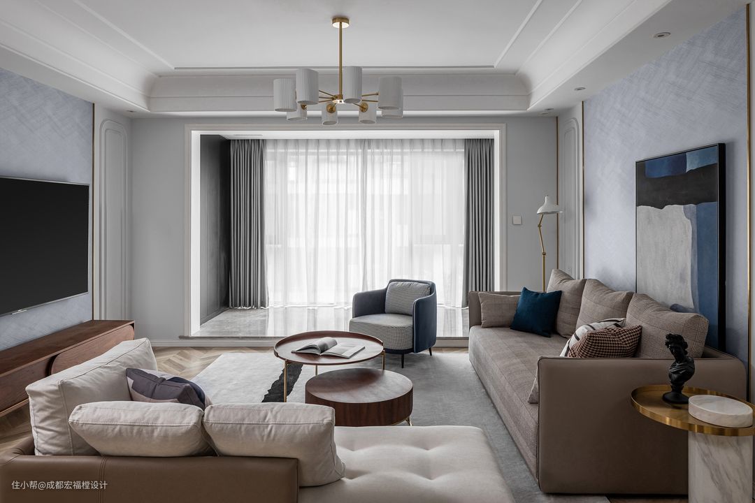 客厅的配色上我们采用暖白、藏蓝、沙色、玳瑁色等低保和色系,营造出一种沉静雅致的空间氛围,可以让人快速的放松自己的精神状态。#湘君 #宏福樘设计 #客厅 #沙发 #地毯 #茶几 #阳台