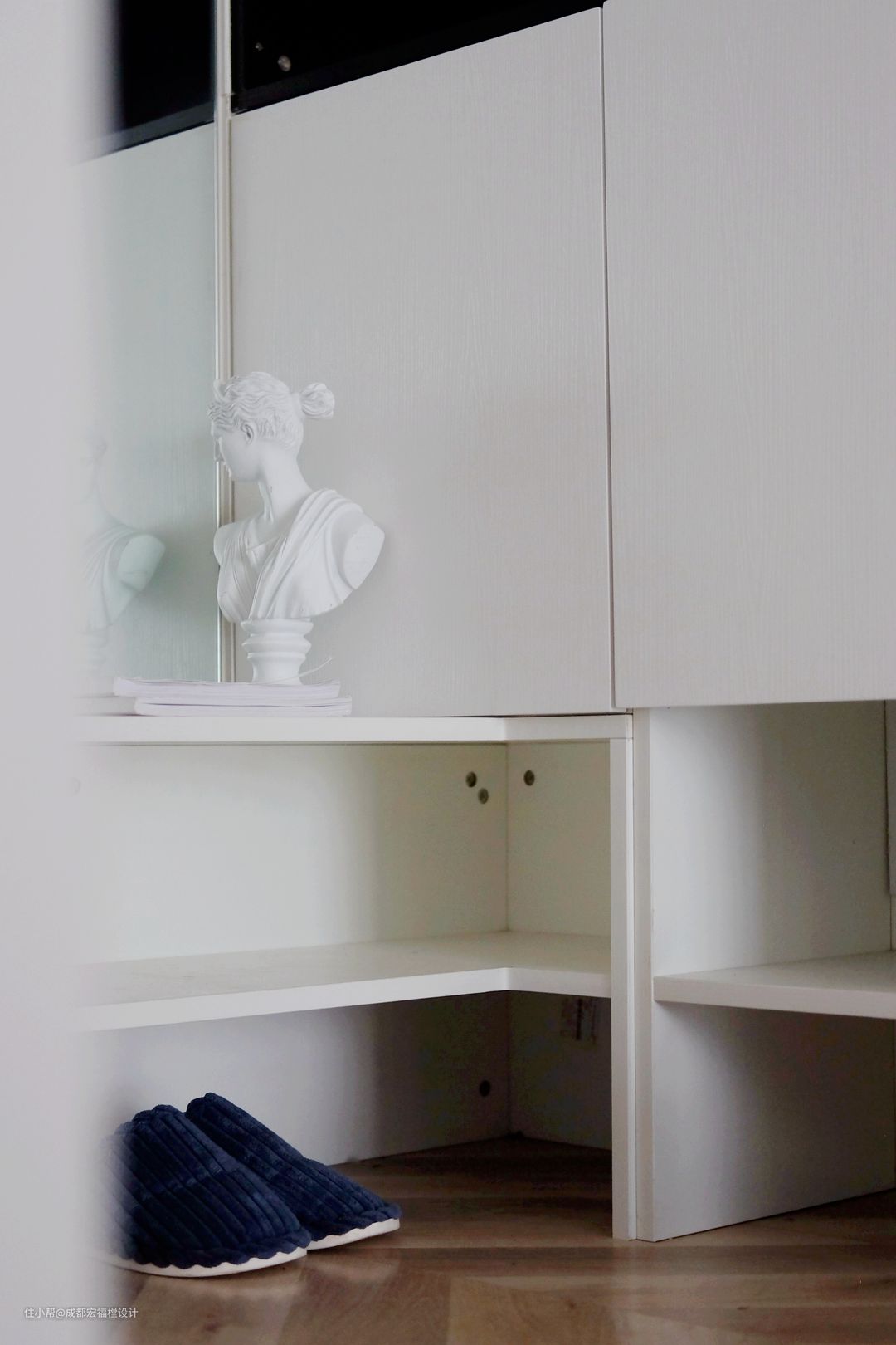 入户右侧原是封闭的储物房,拆除后改造为开放式玄关。左右两面均为超大容量储物柜,中间则是一面完整的穿衣镜。层板间可供屋主平时换鞋和放置经常使用的鞋物。#湘君 #宏福樘设计 #玄关