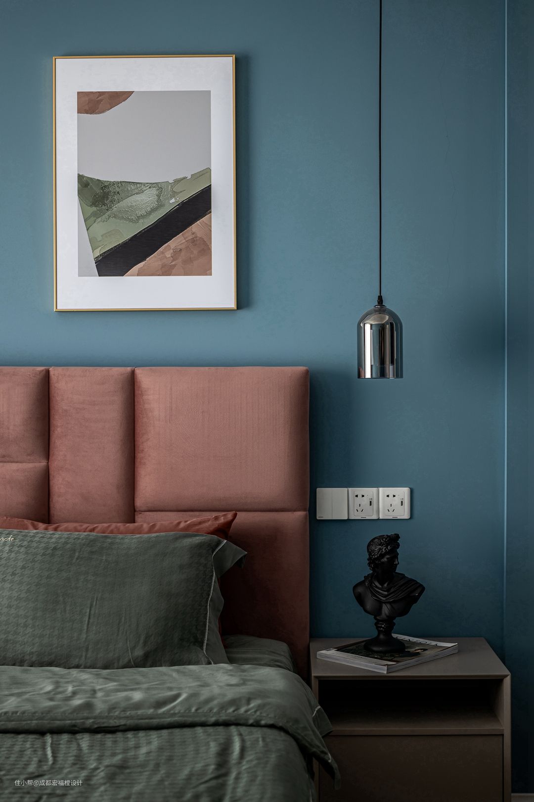 选择了让时光慢下来的浅黛蓝与充满青春活力的香槟粉,呈现出专属于屋主的温柔与知性。不锈钢金属吊灯、金属边框抽象画与石膏艺术摆件的加入,精致柔美的艺术气息在这里得以展现。#湘君 #宏福樘设计 #卧室