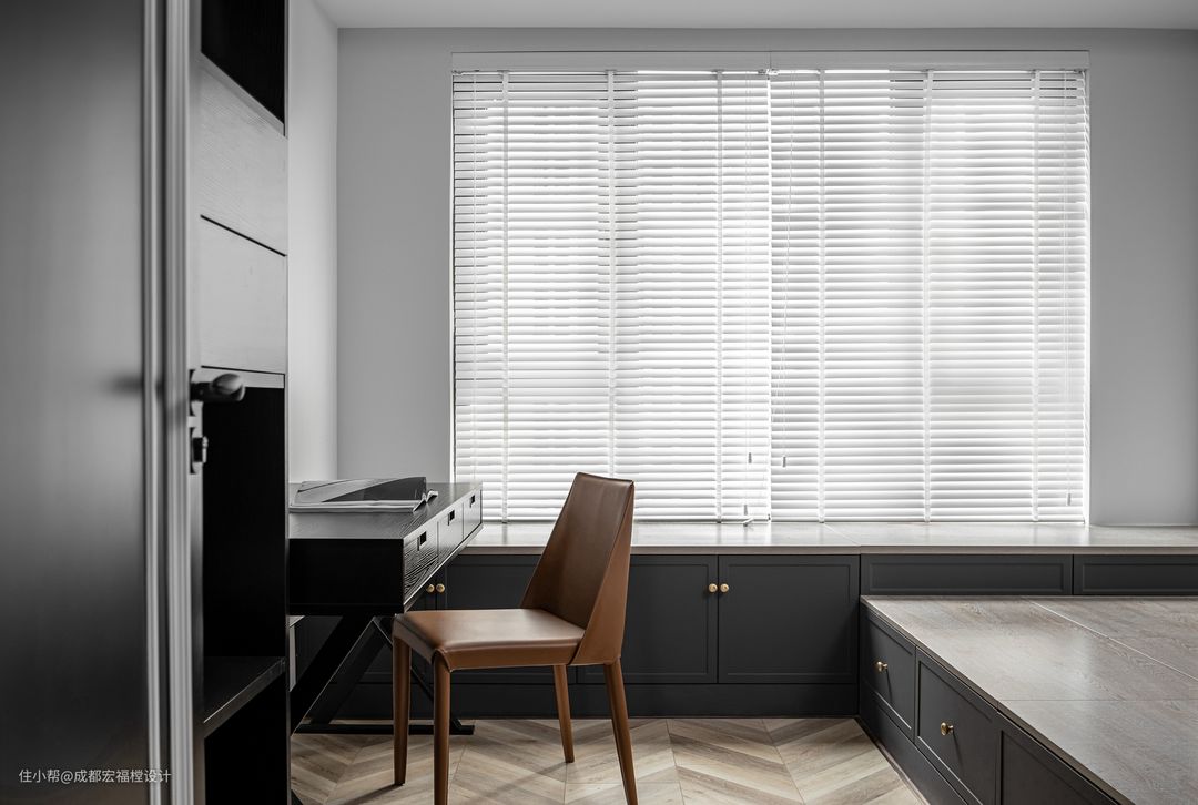 鱼骨拼、百叶帘、金属元素的加入,使现代黑褪去给人压抑和不安的印象,进阶成让人时尚精致的代表。#湘君 #宏福樘设计 #书房 #储物空间