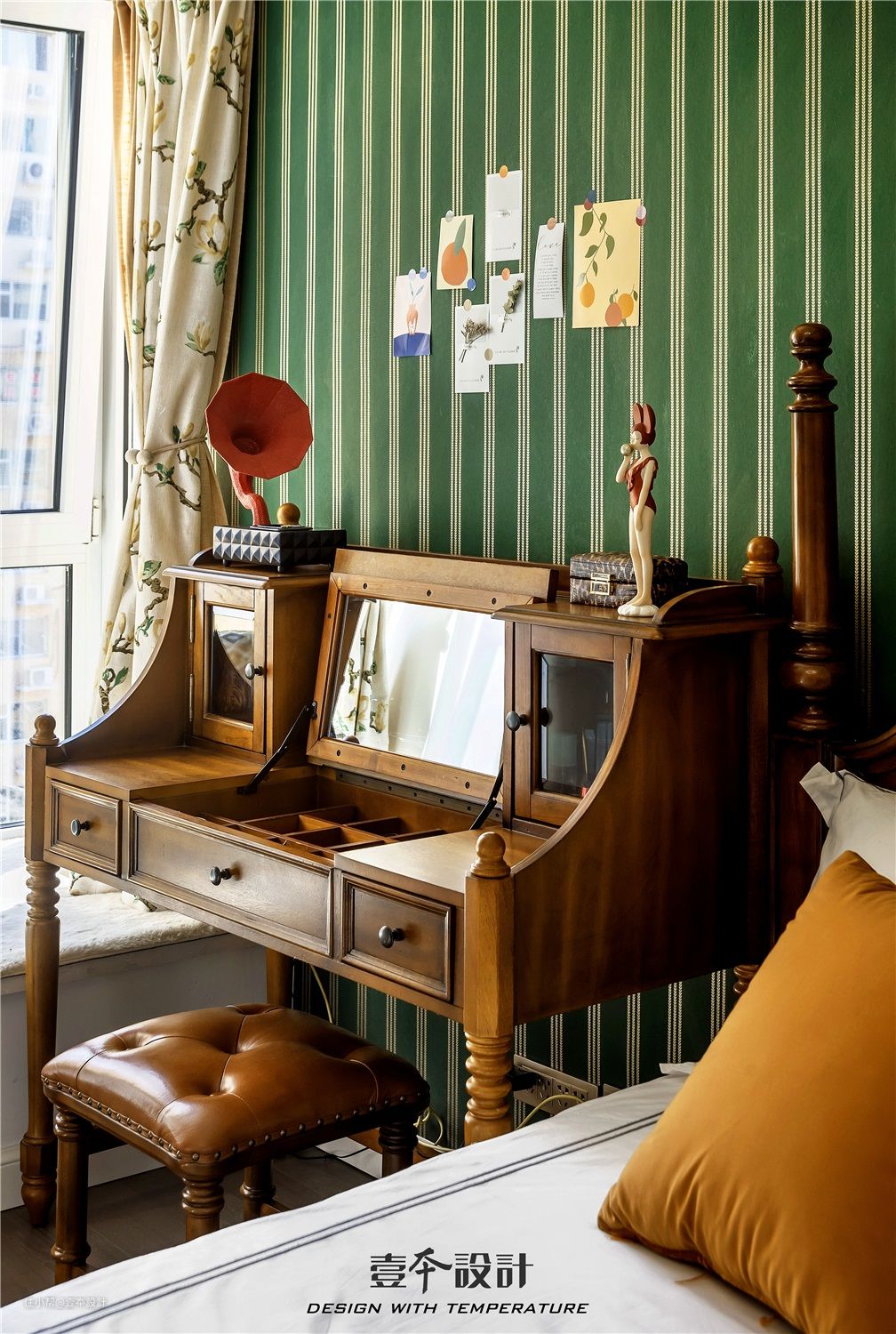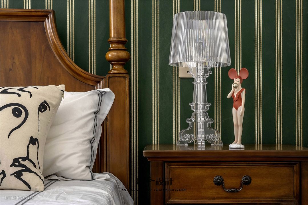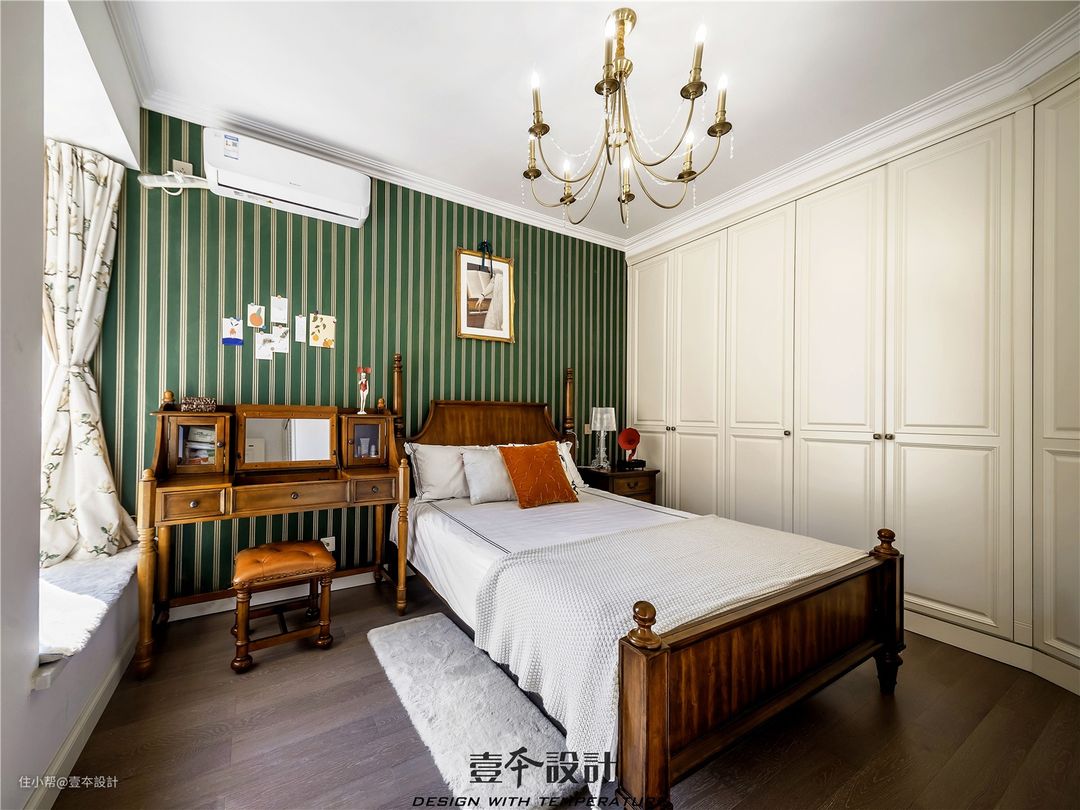 绿色带给人一种生机勃勃的感觉,条纹墙纸具有拉伸空间的视觉效果,实木床给空间营造安稳端正的氛围。整面衣柜更是满足了家里的储物需求。