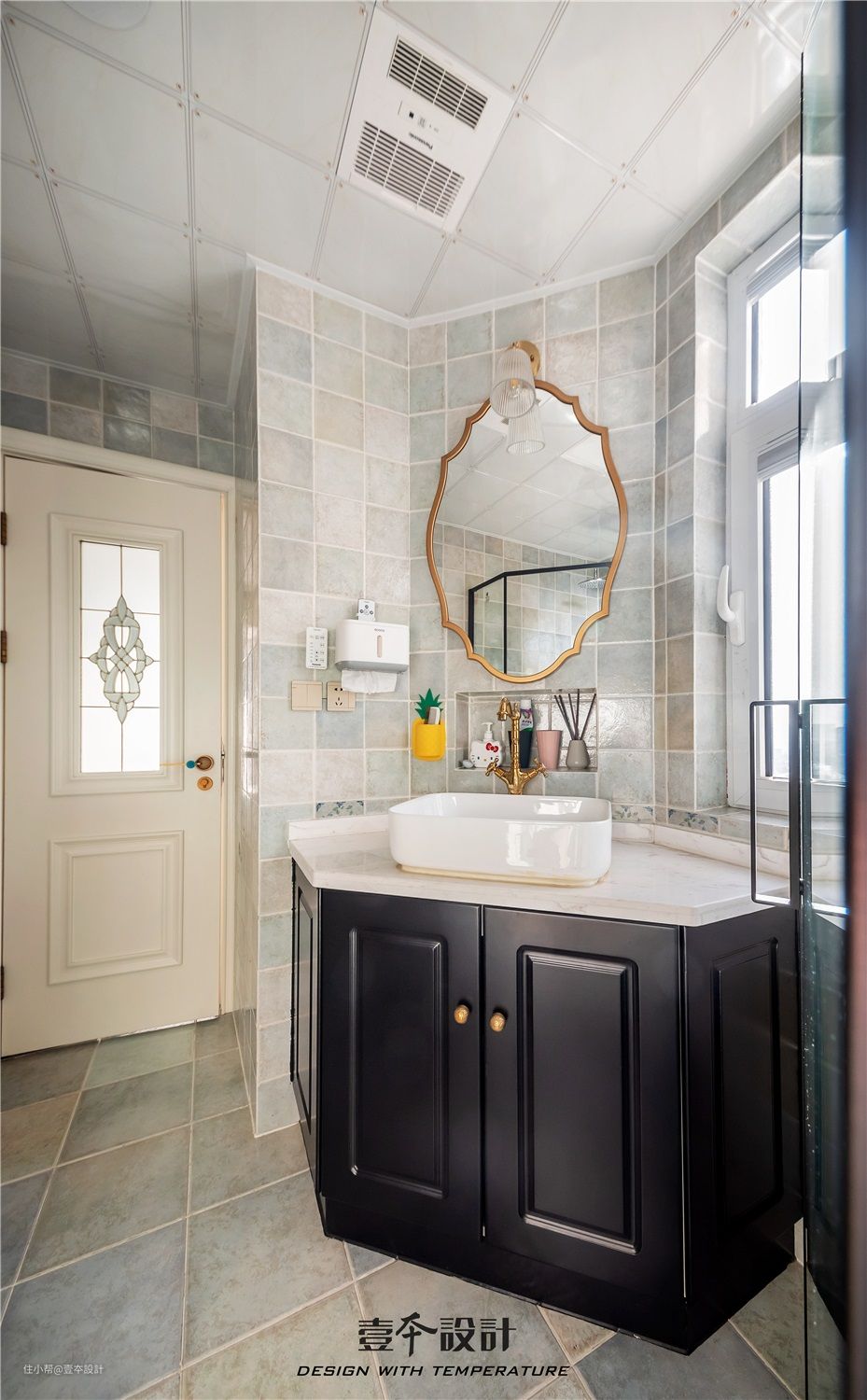 主卫延续美式风格,仿古砖张贴墙面和地面,让小空间也充满温馨与质感。考虑到行走动线,我们设计了带壁龛的斜角墙。设置斜角地柜,简单实用也不占空间,非常适合卫生间的收纳。