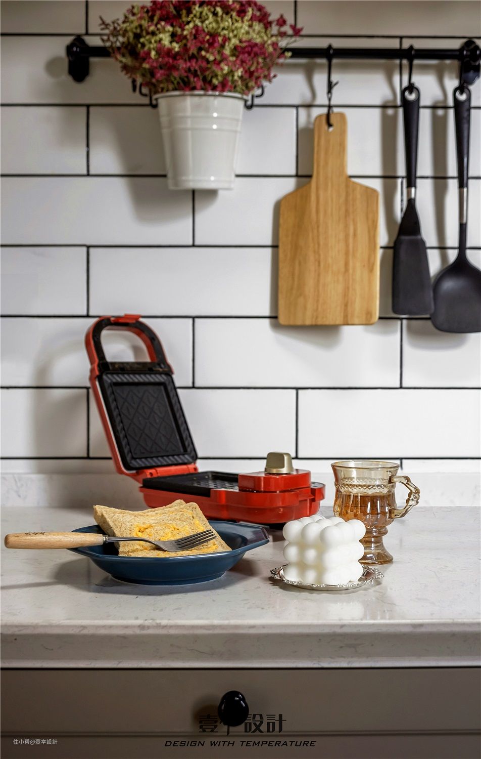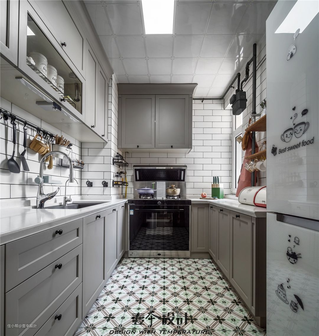 厨房地面花砖+白色墙砖,结合灰咖色橱柜面板,干净简练,文艺而不失优雅。在小厨具的选择上延续了复古调性,让厨房里的小物件也成为空间的装饰。