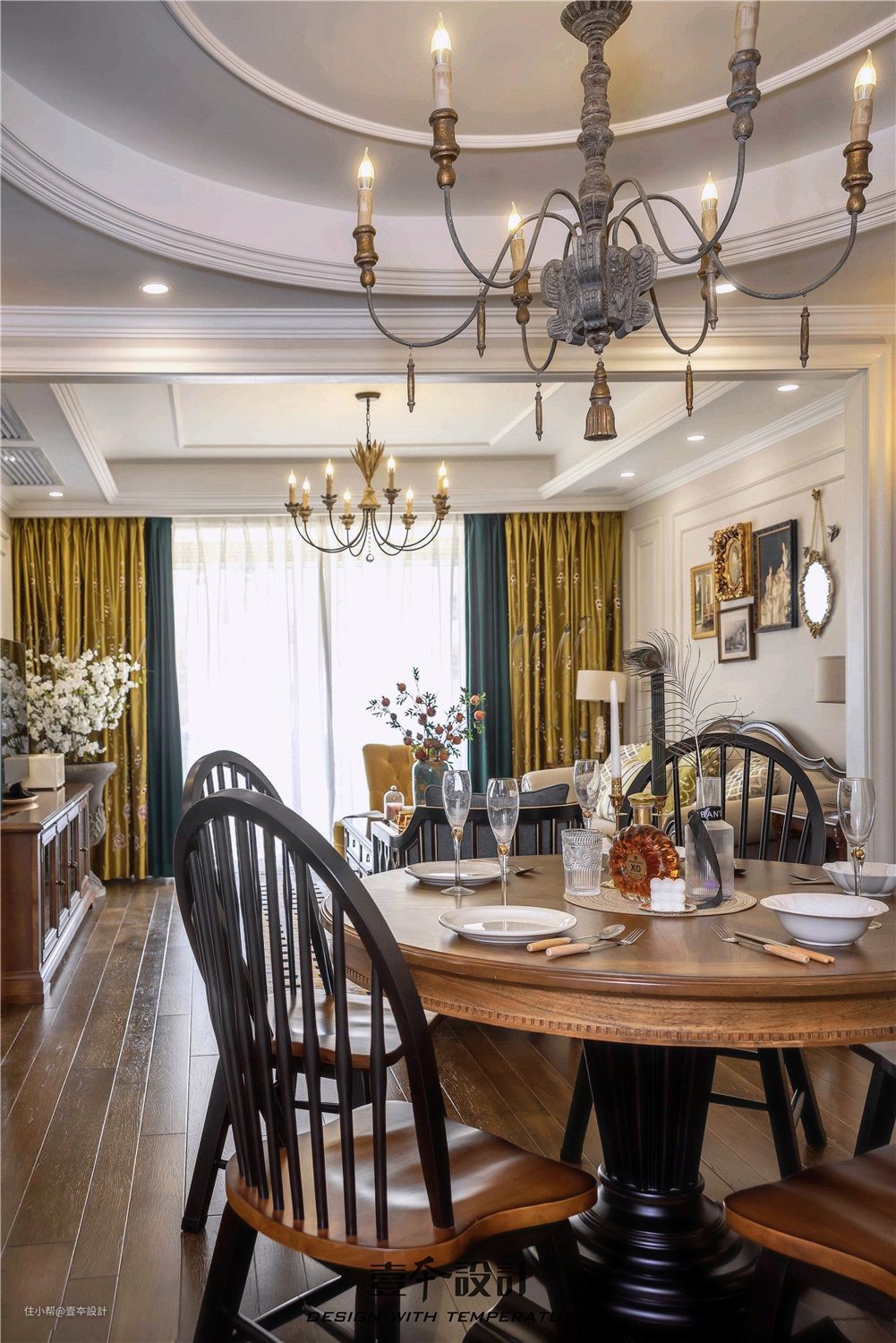 2:原客餐厅为直通形状,空间未作分隔。我们对空间重新规划,将餐厅作为景观中轴和动线流通中心,通向各个功能房间,餐厅以圆弧的形态出现,就像步入宫廷,给人端庄大气的感觉。