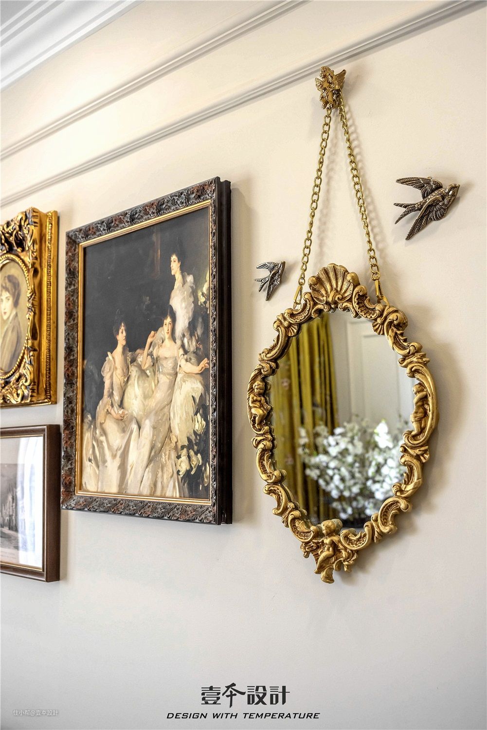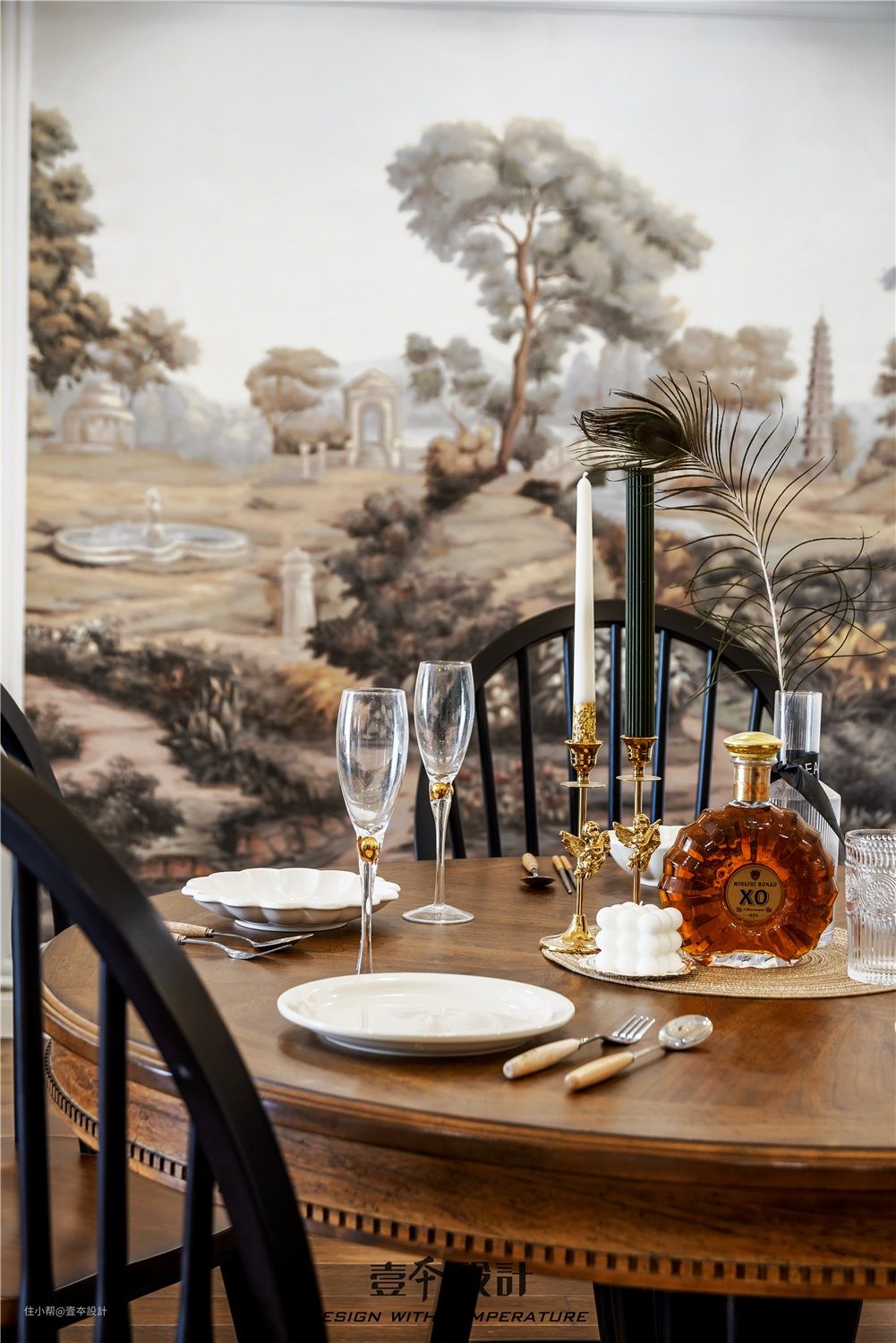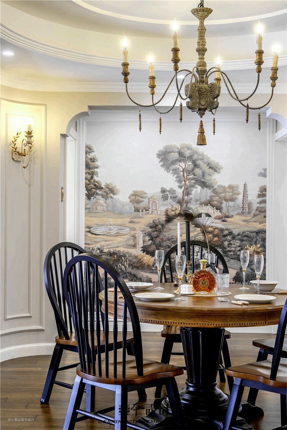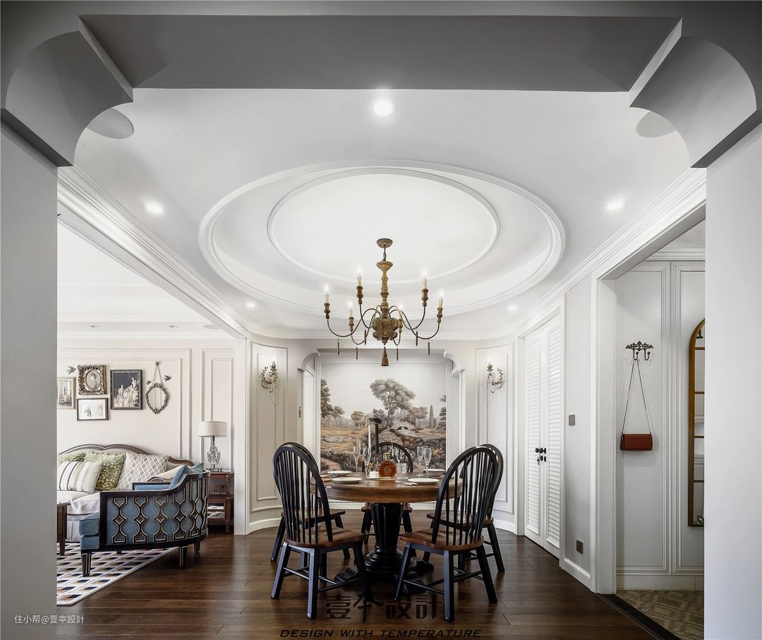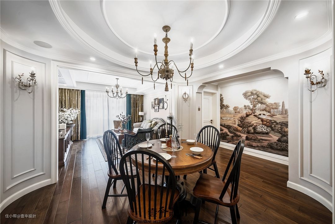 进入餐厅,映入眼帘的是由四角圆弧围成的餐厅,餐厅背景墙由整幅欧洲艺术墙布组成,让空间更富有立体感,也能丰富视觉元素。圆弧上对称的壁灯和餐桌灯相呼应,演绎了浪漫经典复古情怀。