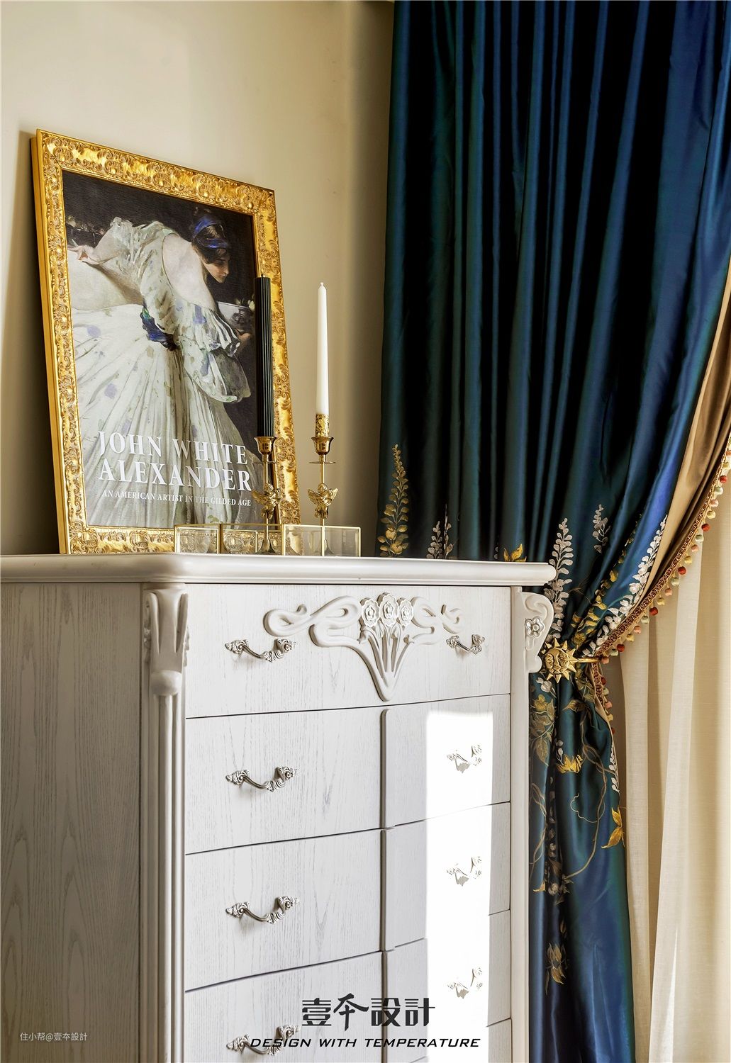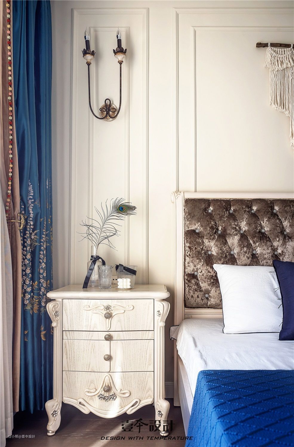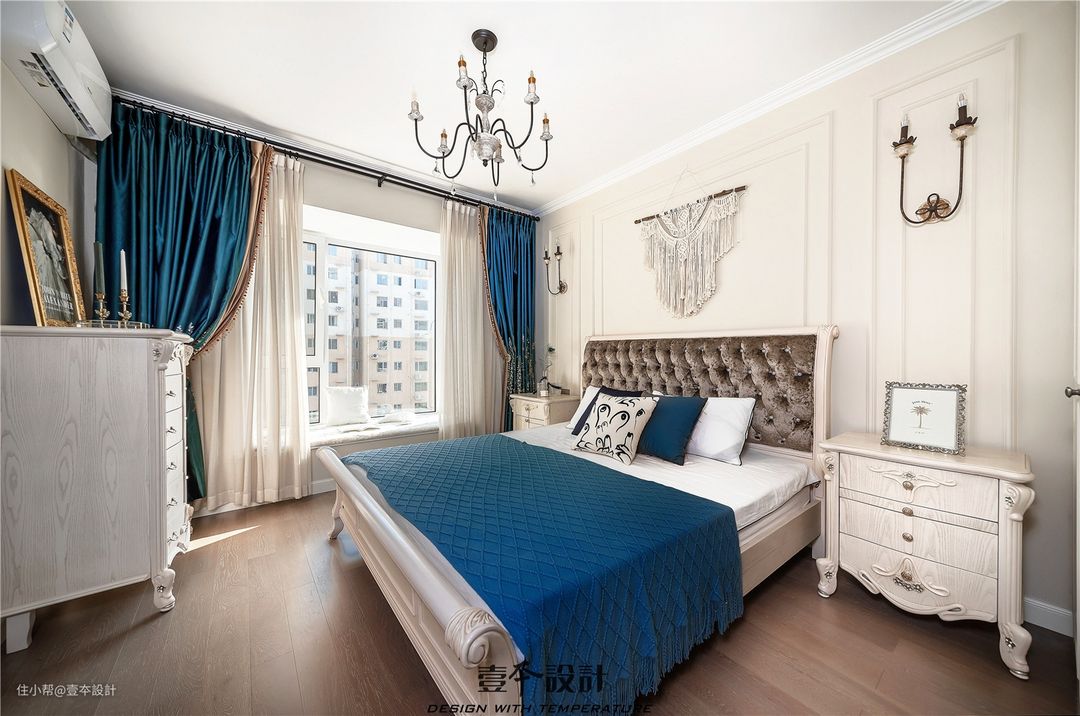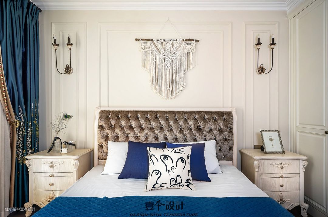 主卧家具没有重新购置,而是从老房子里搬过来的,这在设计之初就需要考虑尺寸形态颜色和整体设计风格的契合。典雅大气的空间氛围,搭配蓝绿色的窗帘,再点缀韵味十足的挂毯,简约的纯色,细密的质感,一份不失精致的静谧与舒适感悄然流露,显得空间更加清爽干净。