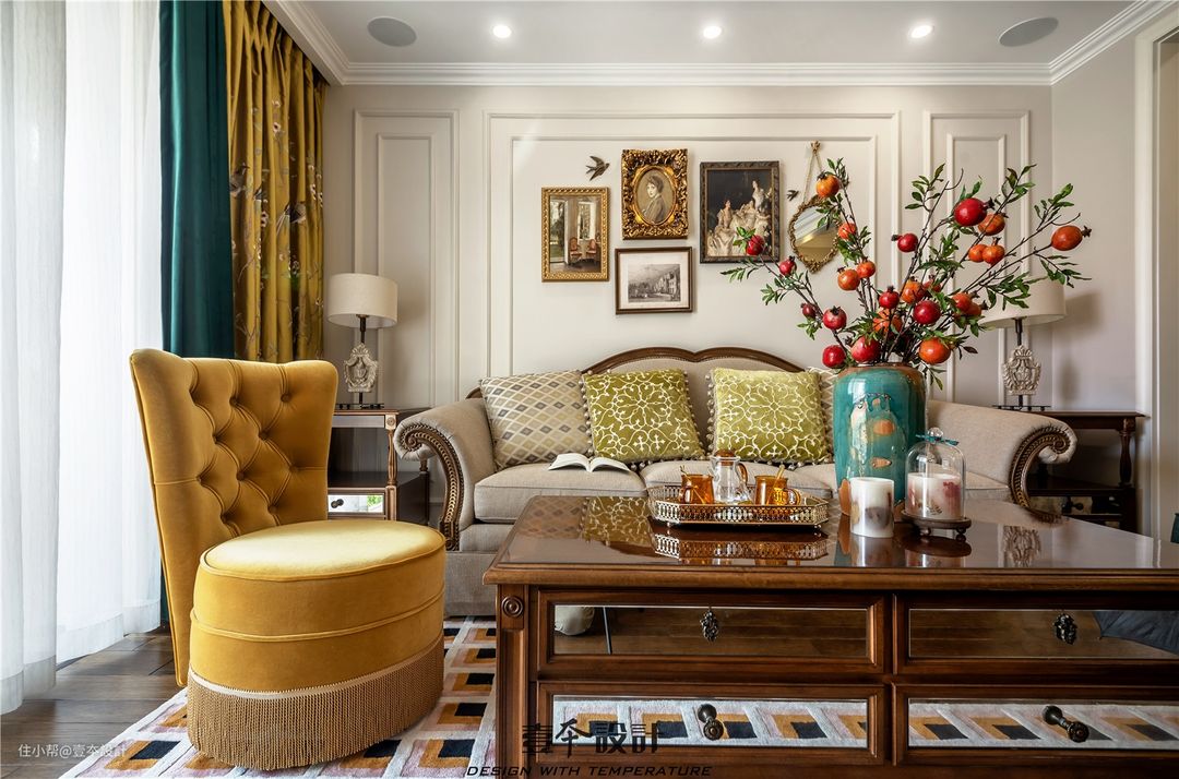 走进客厅,充满线条感和立体感的背景墙,挂上几幅复古的装饰画,整个客厅充满了艺术调性。深色原木茶几和电视柜,带来美式的厚重和怀旧感,米色布艺沙发搭配淡蓝色单人位散发着淡淡的素净和清新优雅,休闲椅和窗帘都是亮黄色,让空间活泼鲜明起来。