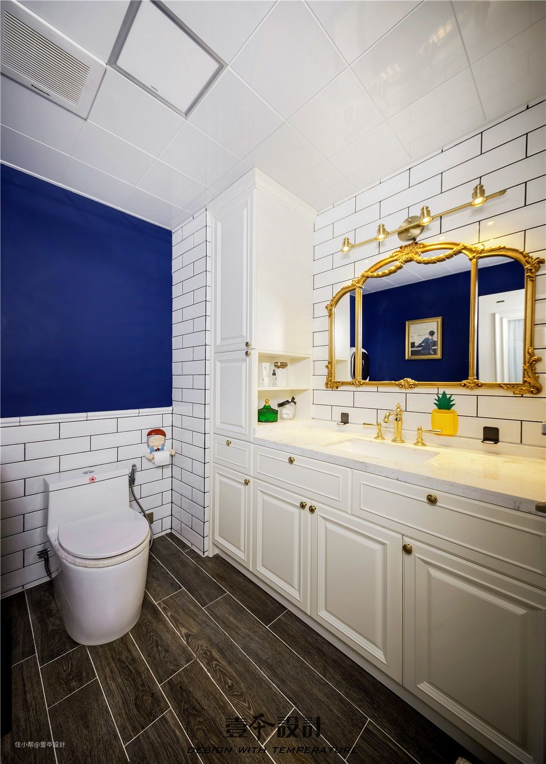 次卫地面采用深色仿木地板的瓷砖,墙上蓝色进口乳胶漆和白色墙砖搭配,看起来既优雅又清爽。金色的镜子更是韵味十足,一股贵族范扑面而来。