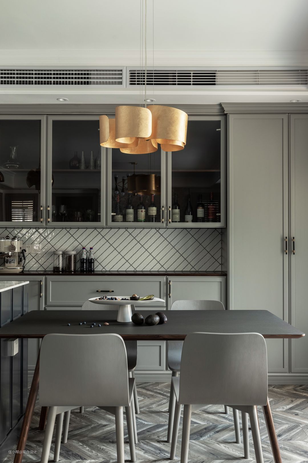 餐厅集西厨、岛台、餐桌,多功能为一体。西厨两侧为顶天立低的储物柜,用以收纳各种杂乱的日常用品,为空间保持长期整洁奠定了基础。中间设计了透明的酒柜,展示屋主收藏的红酒和酒杯。西厨地柜上放置了咖啡机和各种咖啡豆,处处彰显着屋主二人对生活的态度——生活就像咖啡,需要细细品味。
