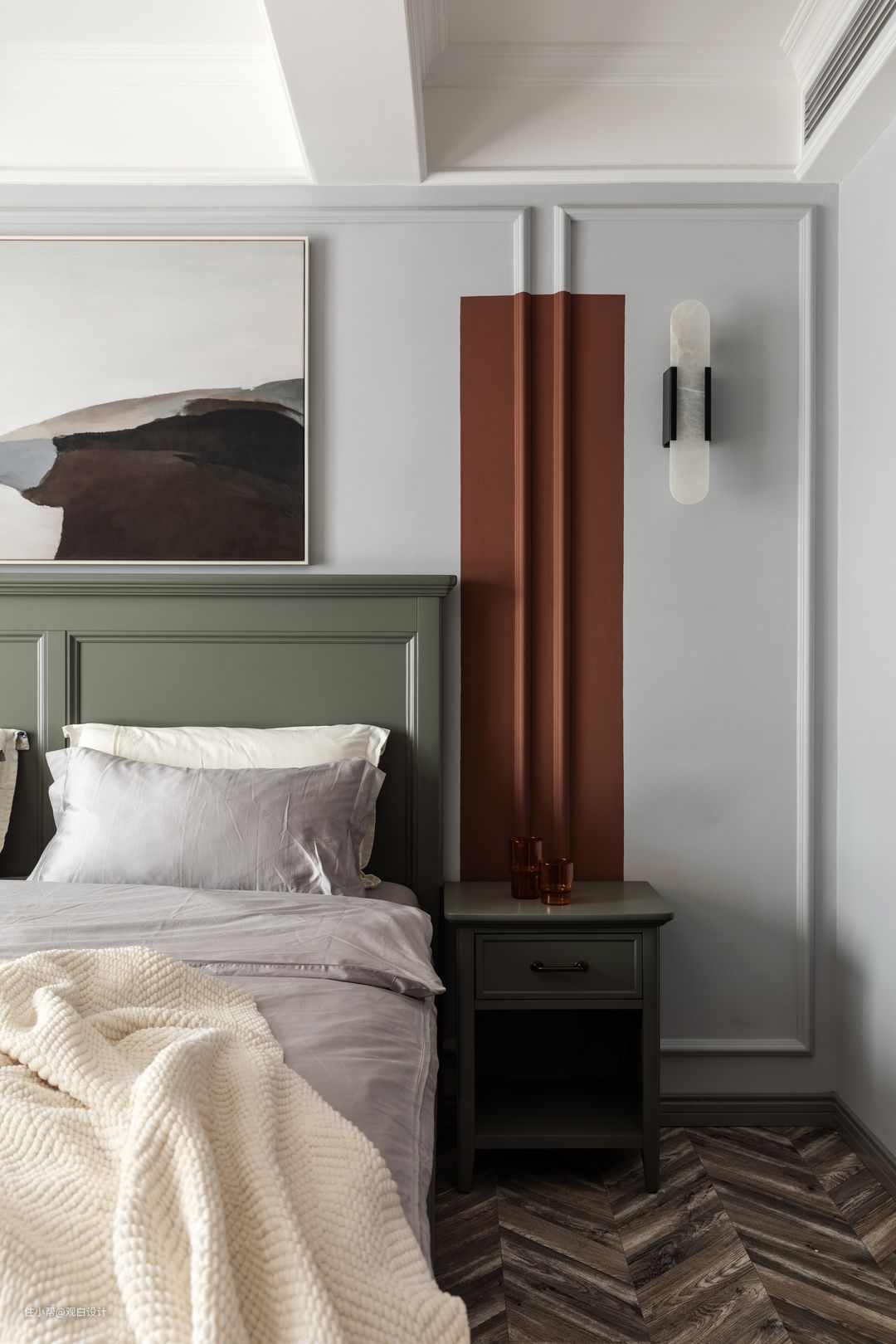 卧室作为私密空间相比公共空间,色彩更加丰富有趣,在大面积浅灰色中融入了红砖和灰绿色,对比色碰撞出更具张力的视觉效果。