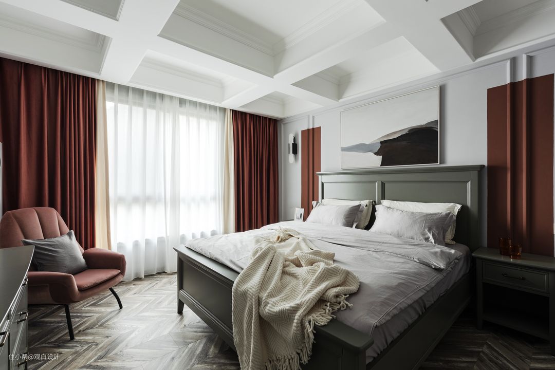 卧室顶面原本有一根粱,突兀的粱横跨整个房间中,我们为此特地打造了格子型吊顶,让其隐藏于其中,巧妙的让它在暴露中隐身掉了。右侧百叶窗在主卧与客厅之间形成互动的窗口,左侧的百叶门连通了主卧与衣帽间,开门便是一个独立的步入式衣帽间,完成了女屋主的梦想。