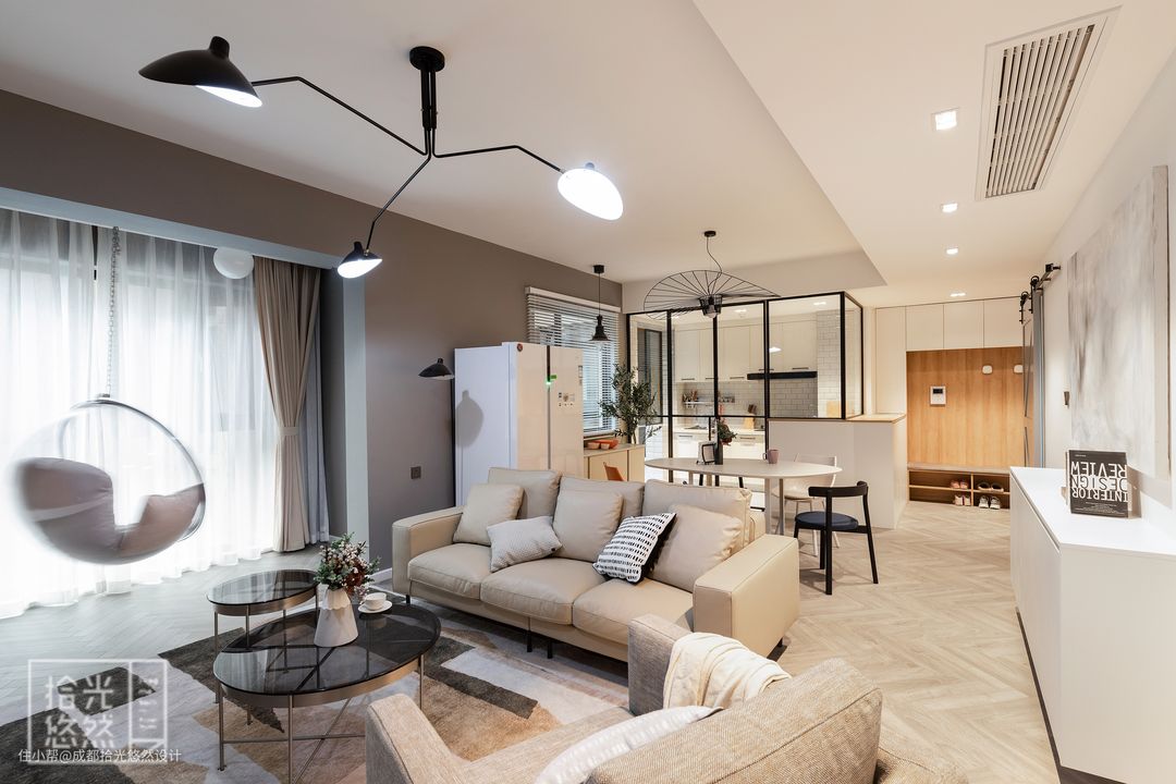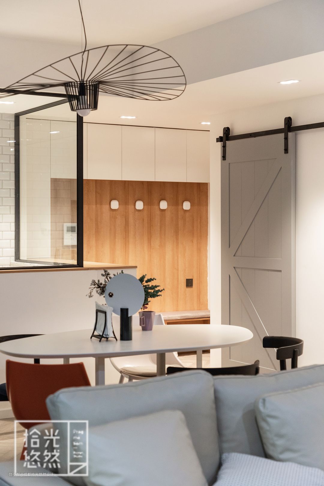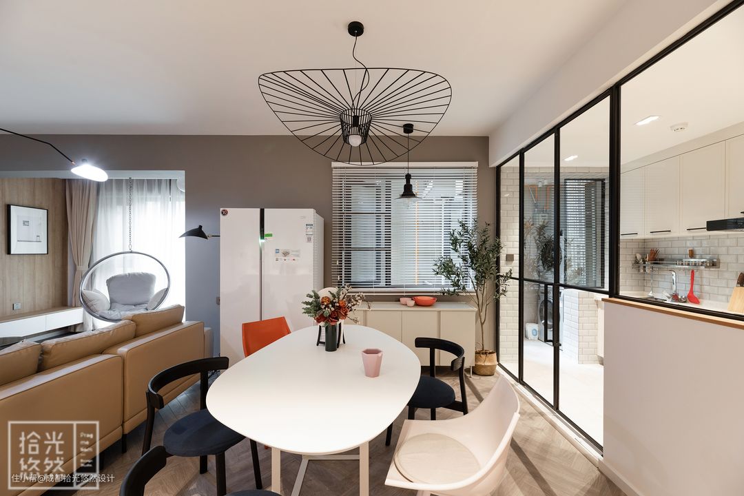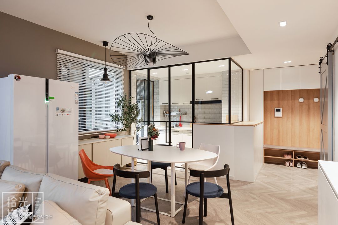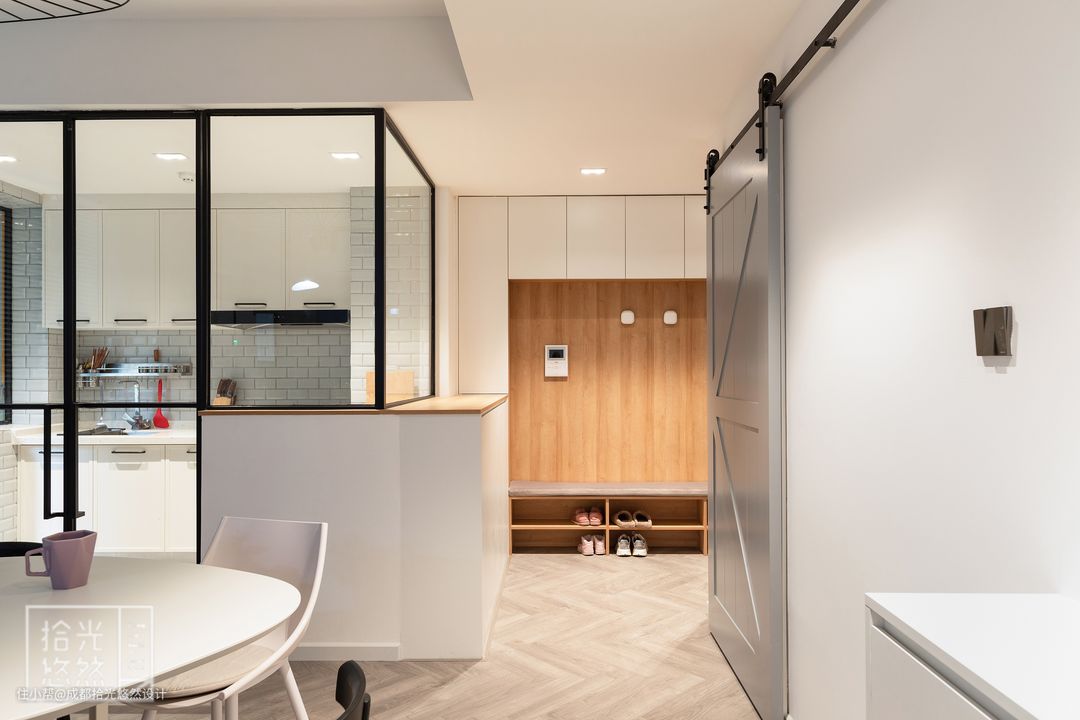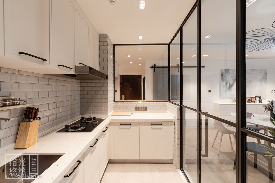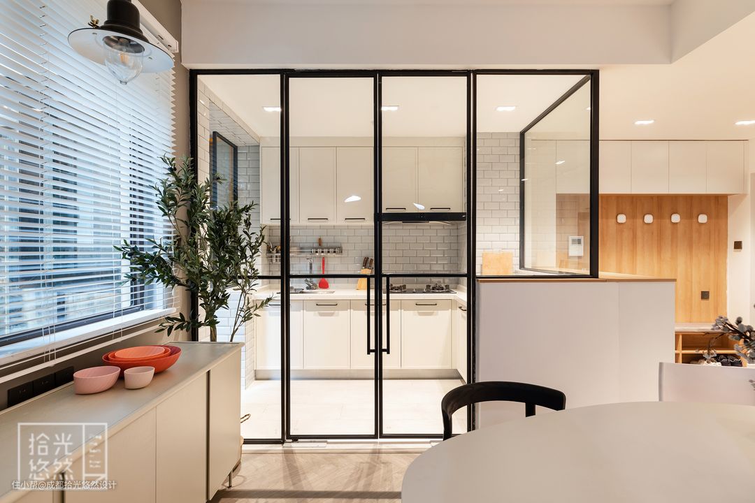 拆除厨房实体墙,用铁艺+清玻作为隔断,空间上更为通透,就算在厨房摆弄时也能看到家人回家,不必拿着铲子还要跑出厨房迎接。