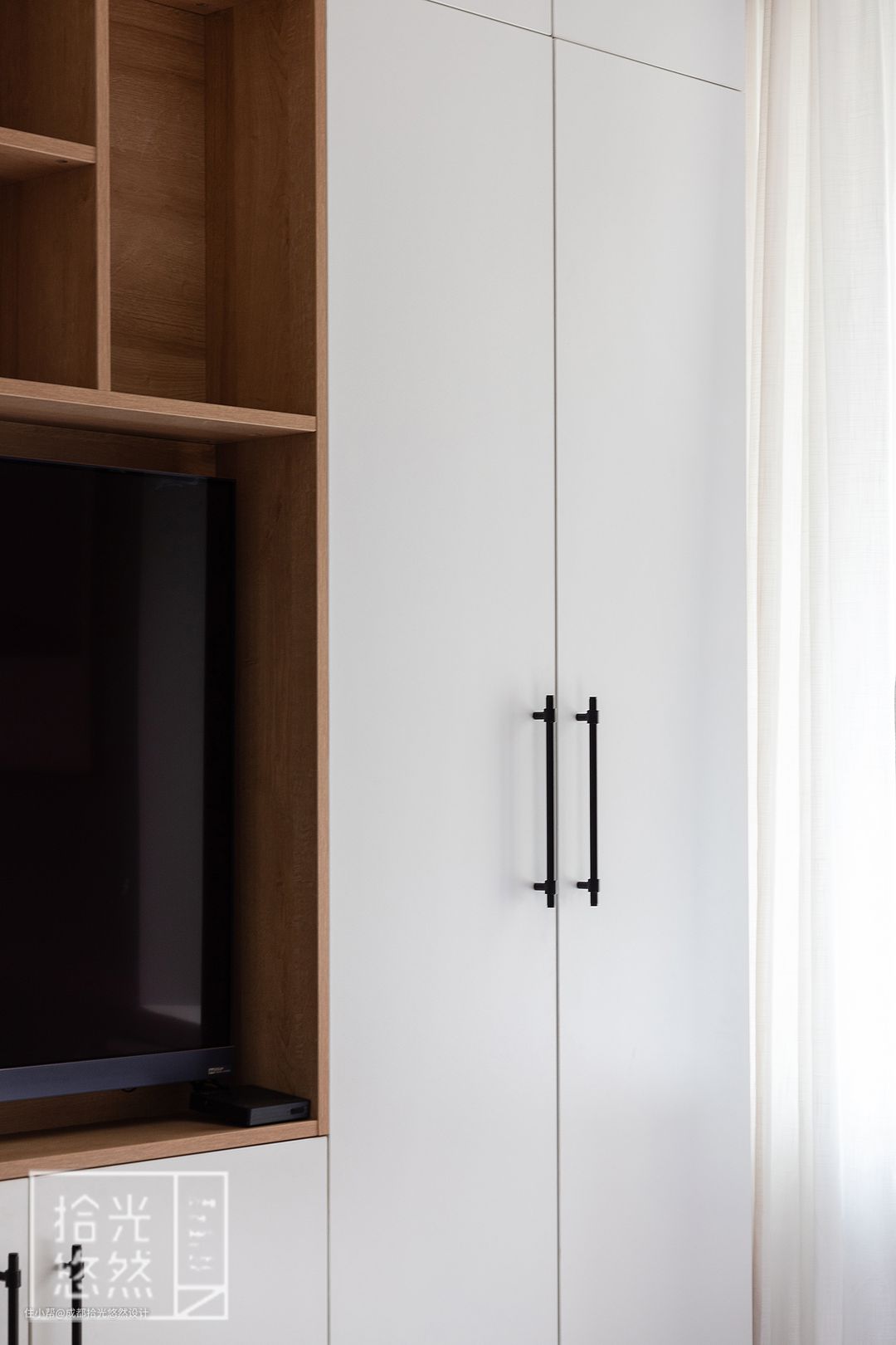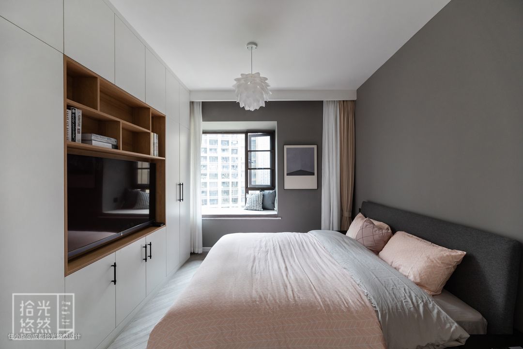 主卧主要用于业主父母的居住,一是有较大的储物收纳需求,二是需要一个单独看电视娱乐的空间需求,所以尽可能的去做了大面积的柜体,并和电视结合来满足业主父母的需求,从灯光上也考虑了不会有直射的吊灯。就算呆在房里看电视和休息、劳动的时候也不会带来不适。
