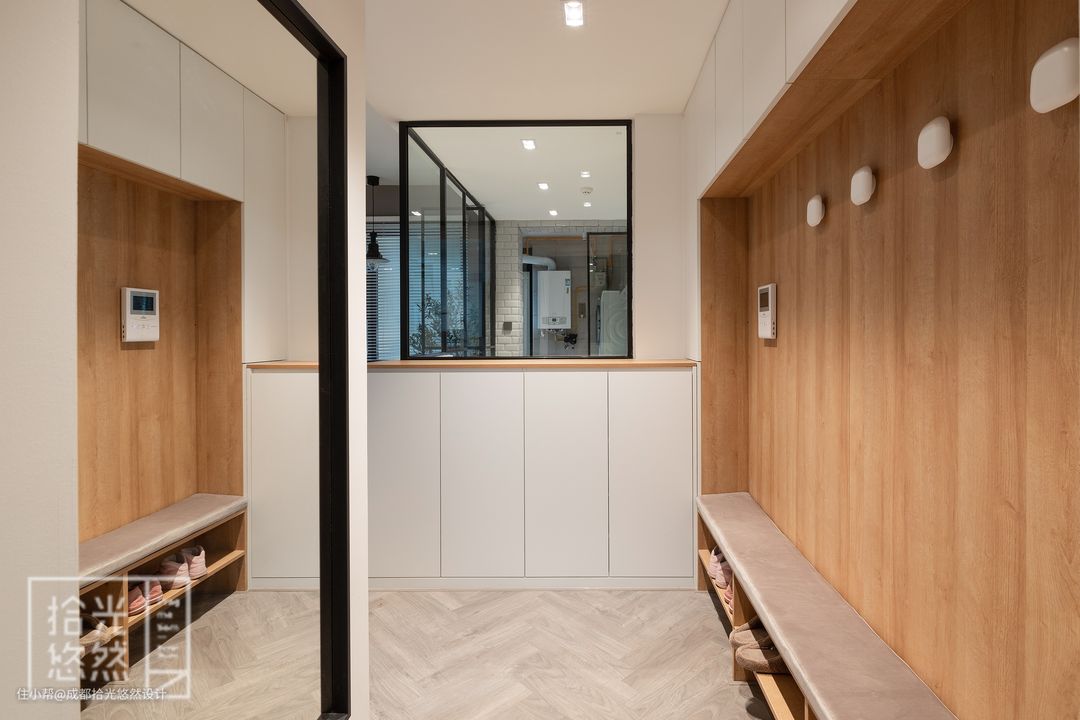 玄关做了整体储物柜,包含换鞋凳,常用鞋区,临时放鞋区,杂物收纳区(雨伞等),和过季储鞋区,利用更衣镜遮挡了电箱的丑陋。