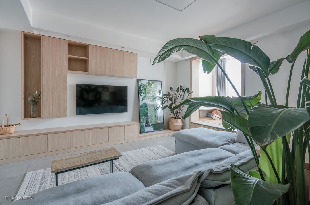 开放格与柜体任意组合形成的电视组合柜,留出空袭悬挂电视。一字型的落地柜,空间整体感和储物兼具。右侧留出了空袭,随意放置挂画和盆景。立在墙面的挂画,是设计师的摄影作品你,慑于日本的美秀美术馆