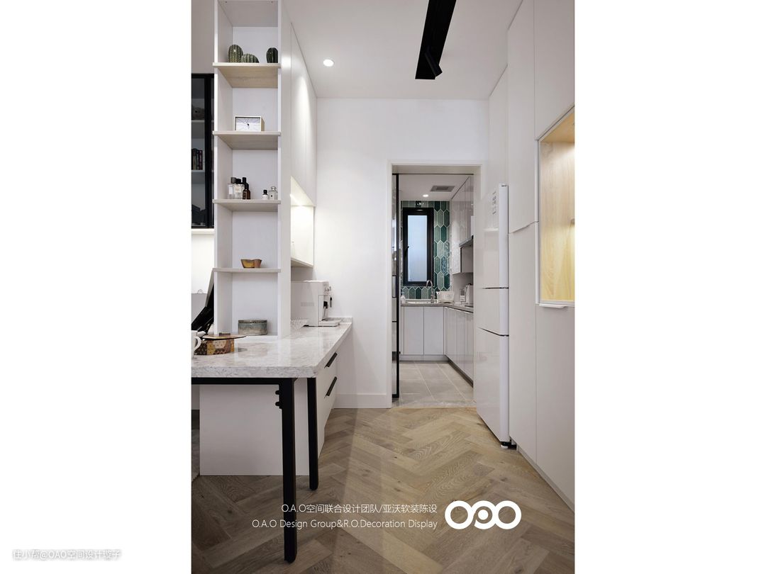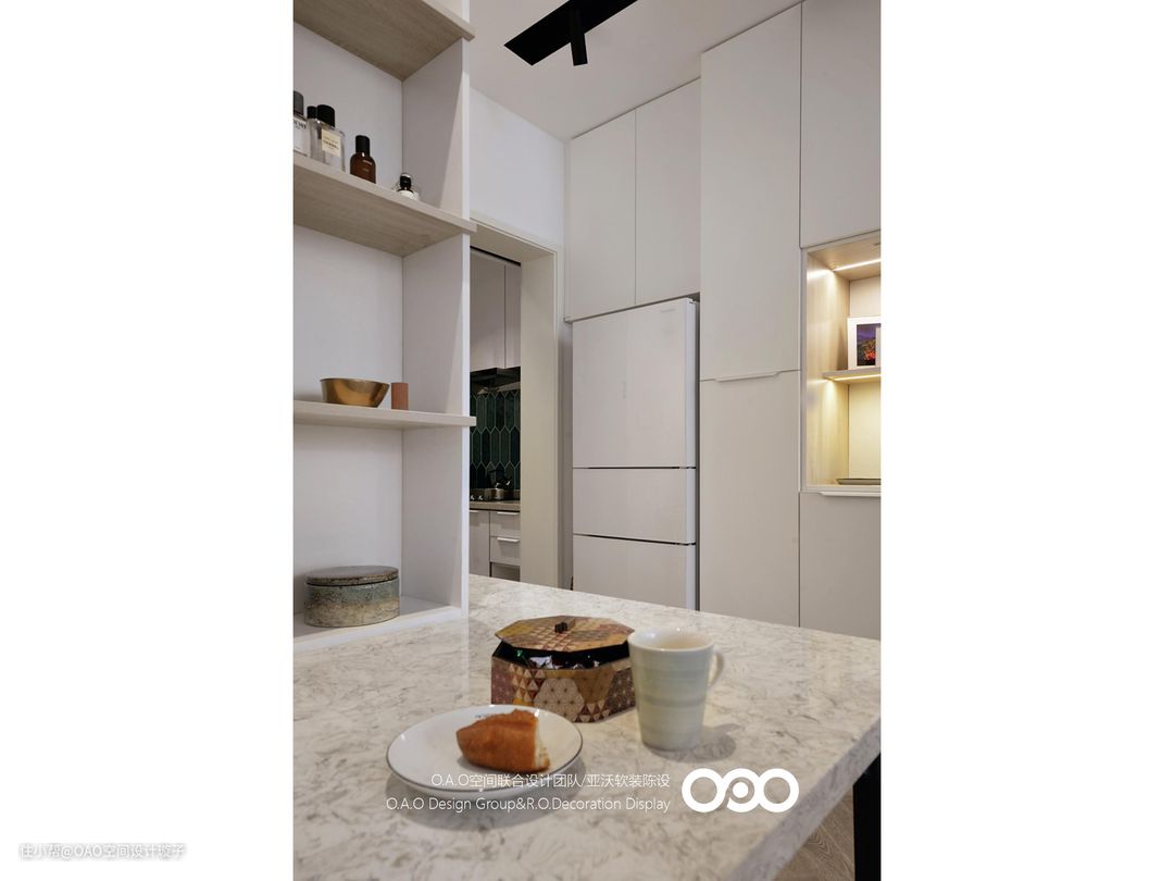 利用最靠近厨房的柜体区域做一个可以收纳零食、餐具和放置家用小电器的早餐区,现在人们在冰箱使用上,早已颠覆了爸妈年代的“冰箱=剩菜剩饭箱”的观念,冰箱安放在早餐区与厨房的动线中间位置,准备早餐的转身就可取拿冰箱食材,餐台到冰箱间1米的动线尺距离,即使两人同时操作也不会觉得拥挤。