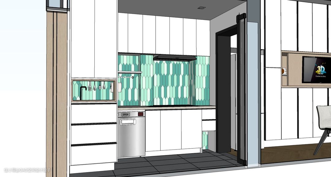 从玄关延伸至卧室门口的厨房空间,特别选择了不规则的混色墙面砖来装饰,从视觉关注重点的角度削弱厨房功能带给人的繁重感。