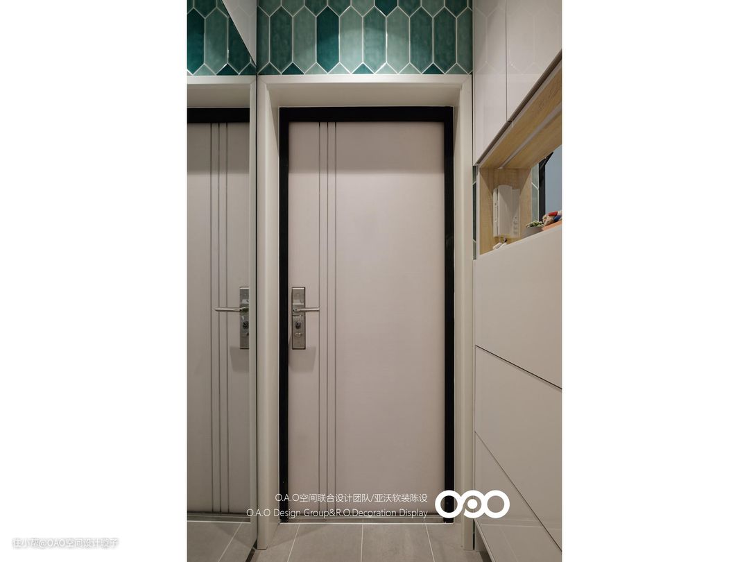 在入户门的左右两侧增加了可以收纳外出鞋和雨伞等小物的订制柜,与视线基本平行的中空套柜除了可以随时观察大门状况,入户回家的随手小物也方便放置。