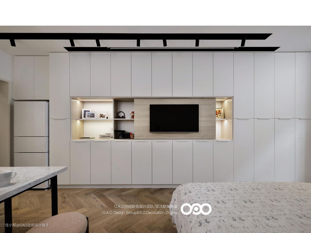 有小伙伴问衣柜电视柜在移动电视不会卡到电源线嘛?毕竟衣柜的深度有60公分呢! 当然在设计进行到审核配套厂商柜体深化设计时,尺寸已经经过测算,放置插座的背板深度不仅要刚刚好方便插拔,在移动电视背板到最边侧时,也要保证移动距离不会扯到电源线。整个过程都需要室内设计师把关。