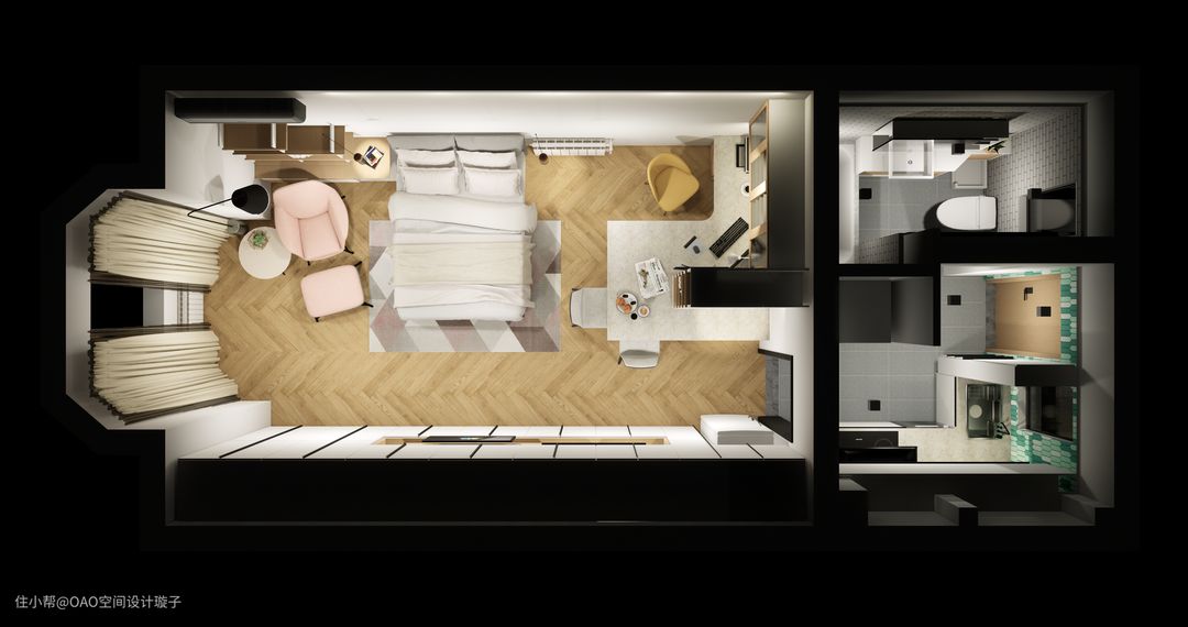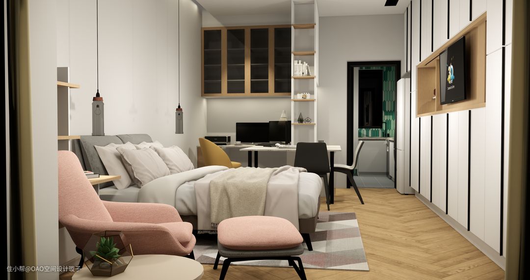 先来一张卧室的模型&现场照片对比吧!麻雀虽小五脏俱全,虽然一眼到底但功能不少,一起来看看吧!