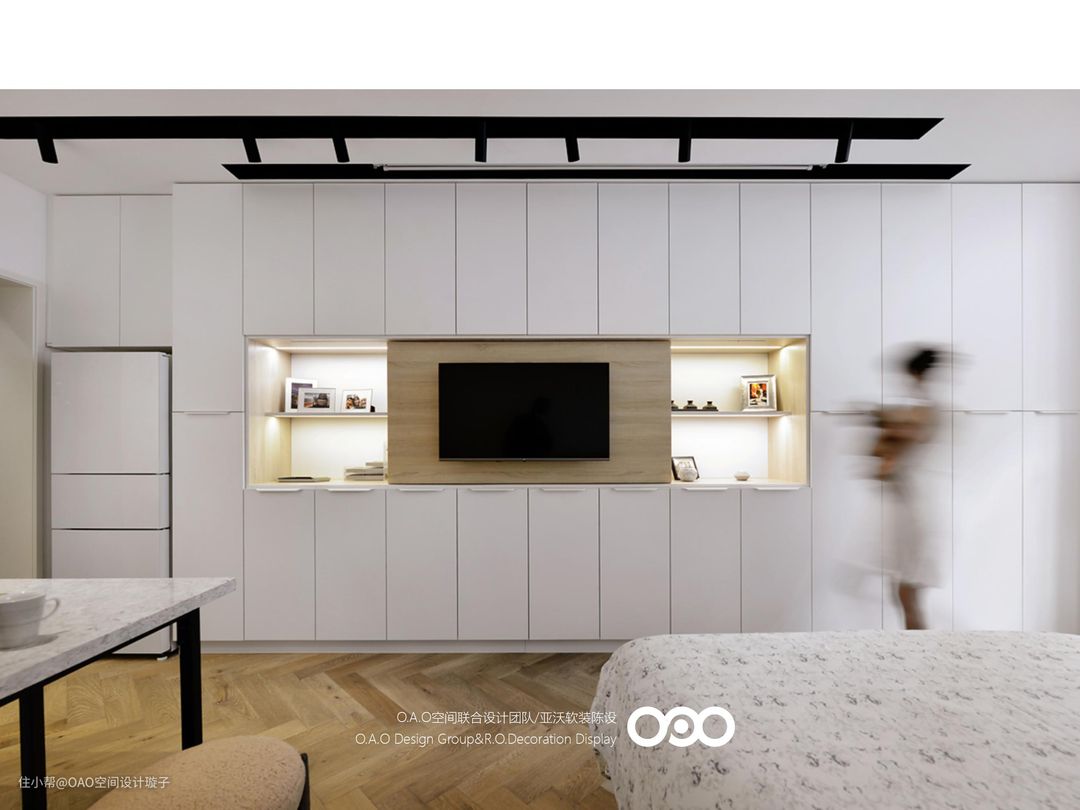 有小伙伴问衣柜电视柜在移动电视不会卡到电源线嘛?毕竟衣柜的深度有60公分呢! 当然在设计进行到审核配套厂商柜体深化设计时,尺寸已经经过测算,放置插座的背板深度不仅要刚刚好方便插拔,在移动电视背板到最边侧时,也要保证移动距离不会扯到电源线。整个过程都需要室内设计师把关。