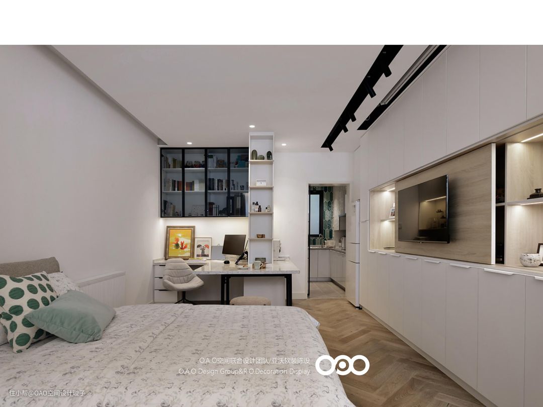 对了!说好的吃早餐和工作时都要能看电视新闻呢!这个6米面宽、60公分深度的通顶衣柜+展示柜+电视柜组合,在这个小小的居室完全感受不到它巨大的存在。 但在集合了不同功能的柜体组合之上,还增加了一个小玄机:壁挂电视轨道,有了这个轨道小配件,早餐起床第一件事就是打开电视看新闻的习惯,无论是在休息区还是在吃早餐或是工作,都可以移动电视机位置,达到最好的视线效果。