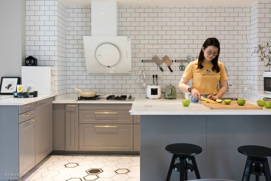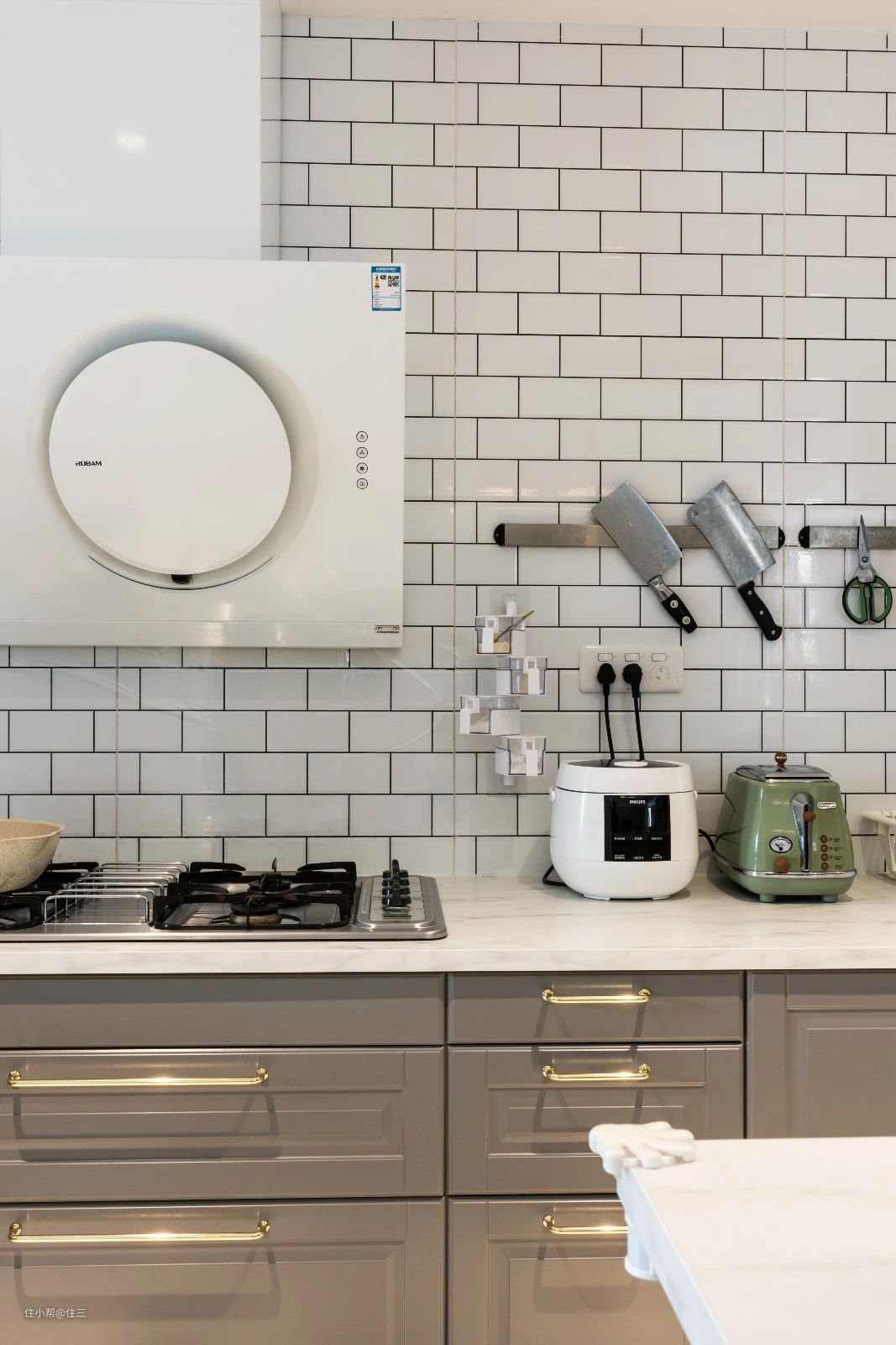 宜家的橱柜经典的搭配灰色搭配金色的拉手。