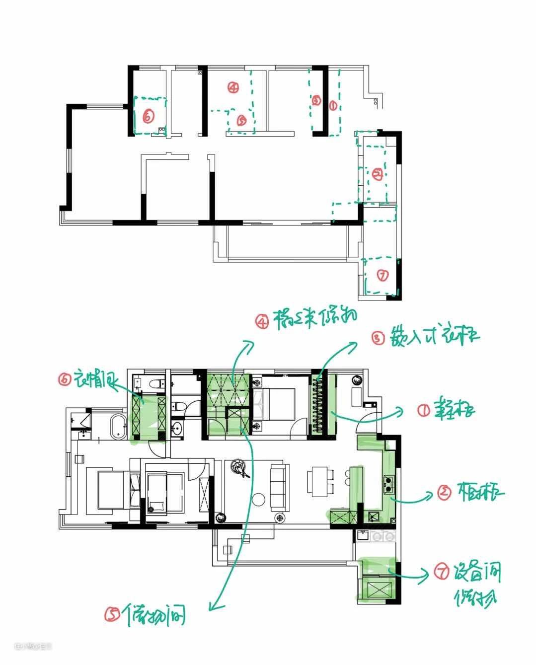 这张图详细展示了,在没有做全屋定制衣柜的情况下如何利用储物间体系进行合理的收纳。 1⃣️入户进门的位置鞋柜的收纳,利用搁板+鞋盒+窗帘的状态。 2⃣️入户就可以感受到超大西厨,整体都是在宜家定制的橱柜,2个师傅整整安了2天,这组鞋柜也是等到宜家周年庆折扣的时候买的,如果没有记错花了1.8w,还利用这个边角料让师傅做了阳台的双人工作台! 3⃣️父母卧做了一个嵌入式的收纳间,利用宜家艾格特+窗帘进行衣服的收纳。 4⃣️小次卧做了一个榻榻米,榻榻米是用的兔宝宝的免漆板现场定制的收纳大件的褥子等。 5⃣️小次卧不光做了榻榻米,还有一个mini的储物间,储物间里用了艾格特主要放一些日常杂物的收纳。 6⃣️主卧榻榻米做了艾格特进行收纳衣物。 7⃣️生活阳台隔成了2个部分,一部分是设备间放了全屋净水的设备还有中央空调机箱,另外一部分放了洗衣机烘干机,还有壁挂式洗衣机以及一个小的洗手池。