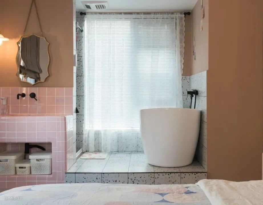 主卧干区是用粉红小砖砌的,搭配naso的镜子和小吊灯~